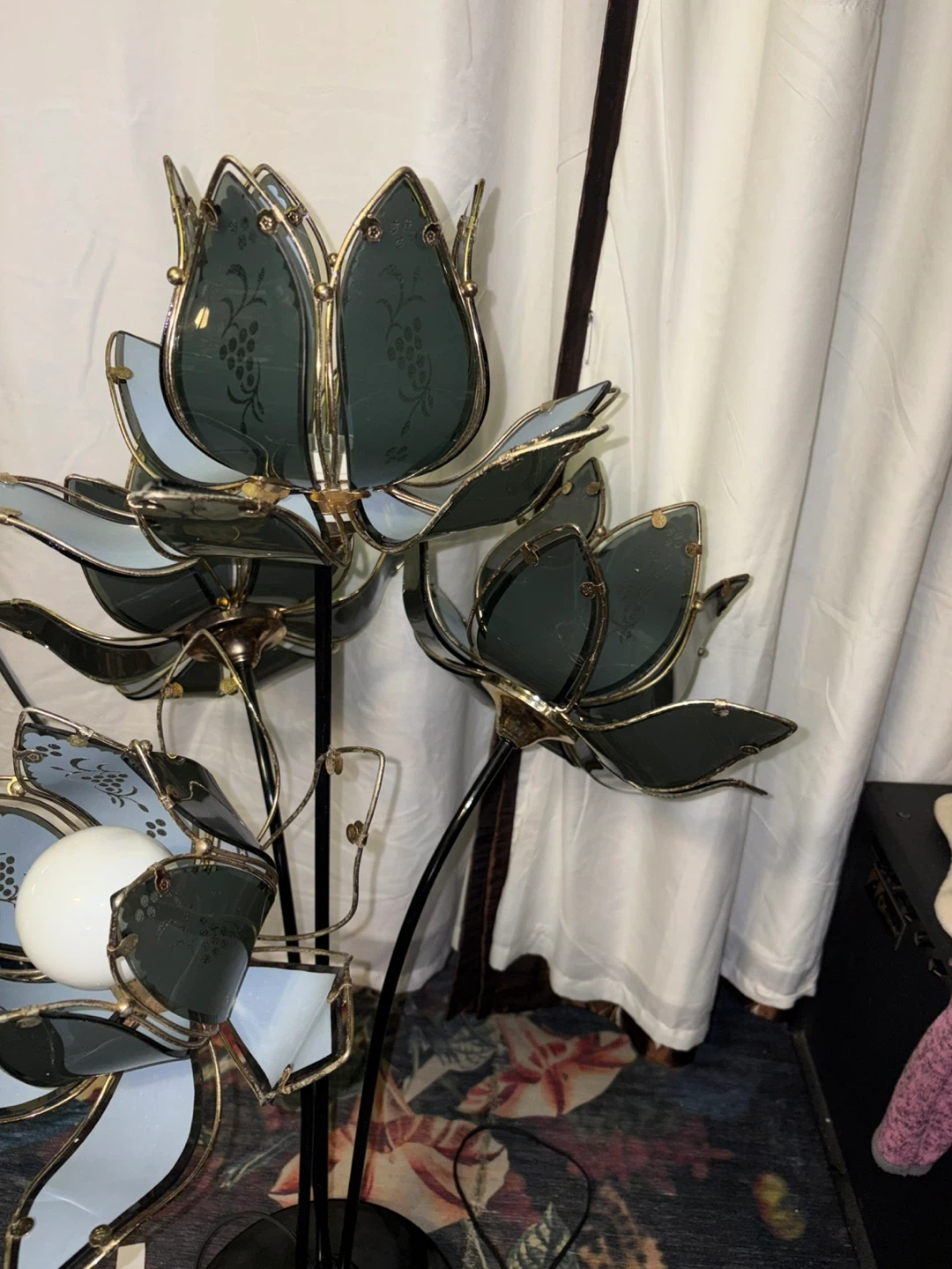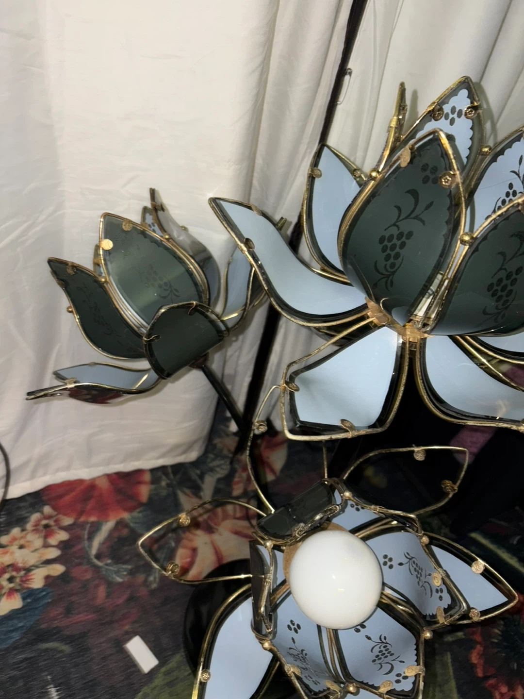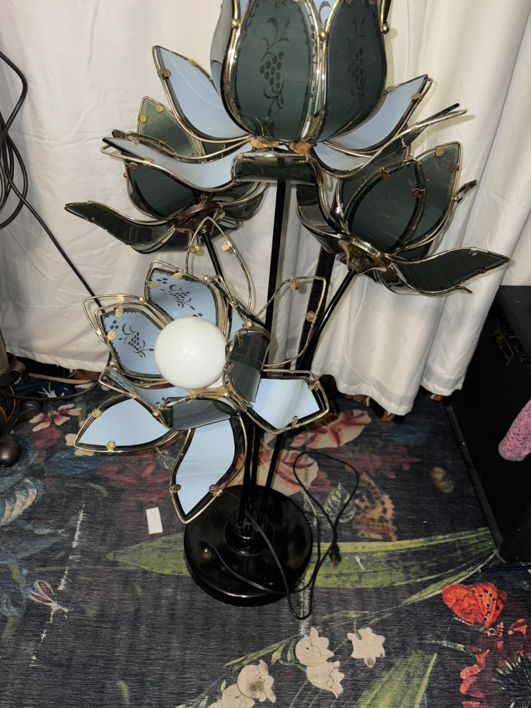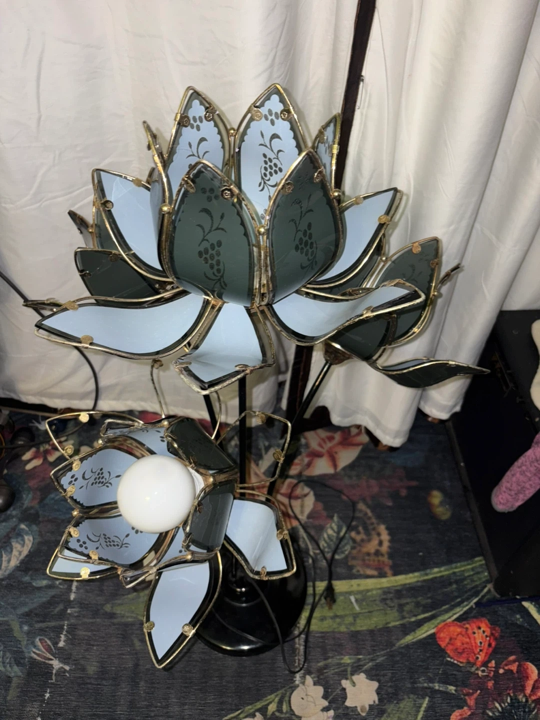 This unique piece is a vintage Hollywood Regency-style lotus lamp from the 1980s. THIS LAMP IS VALUED FROM $470 TO $790. The only flaw is that the children who moved lost three flower petals (replacements are available on Amazon). These lamps were popular in the 1980s and are known for their distinctive flower-shaped glass petals, often featuring a "touch" mechanism to toggle between different light settings.