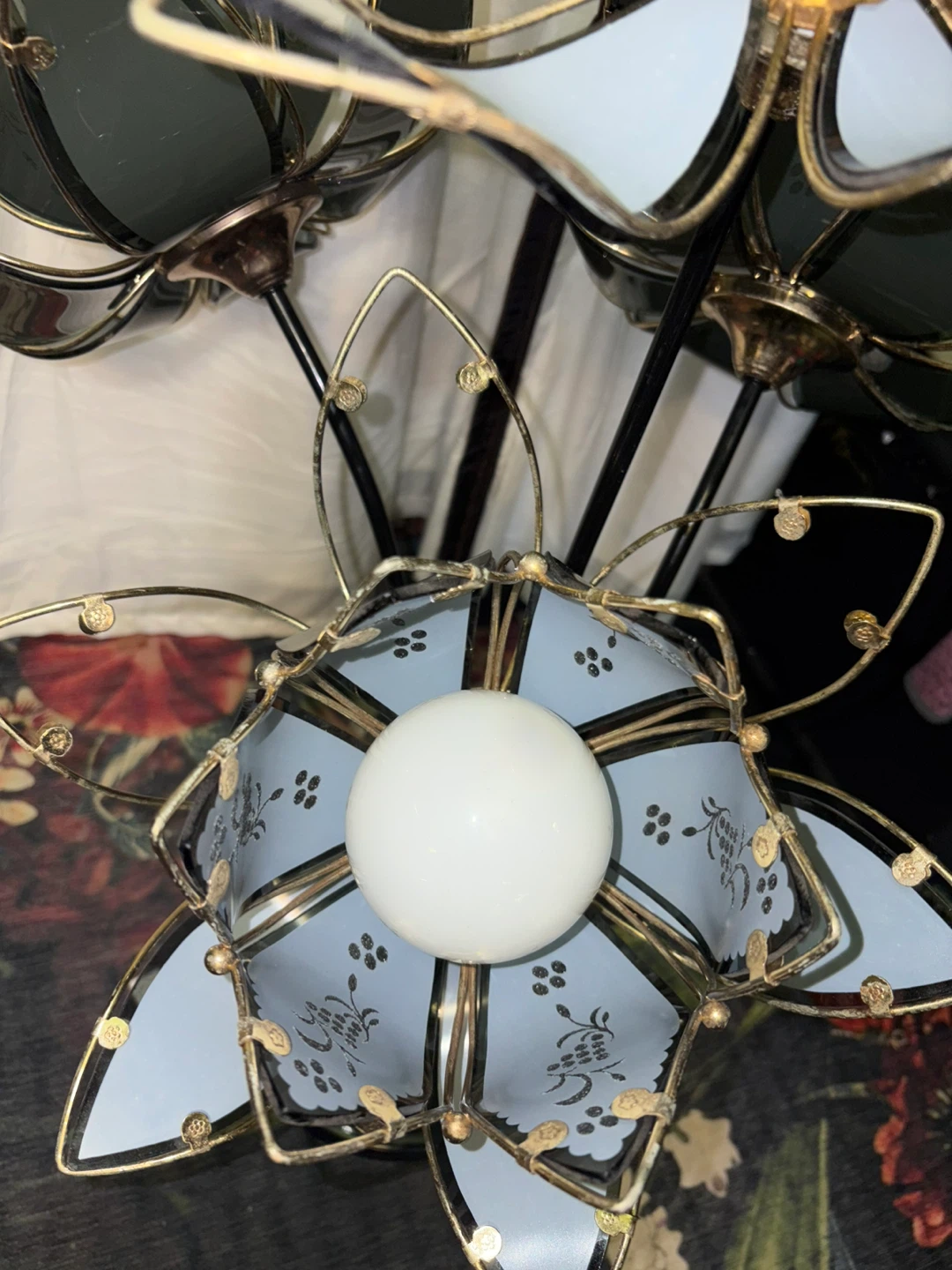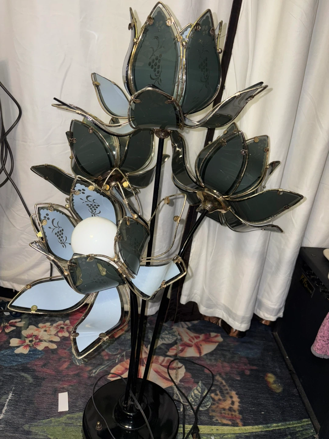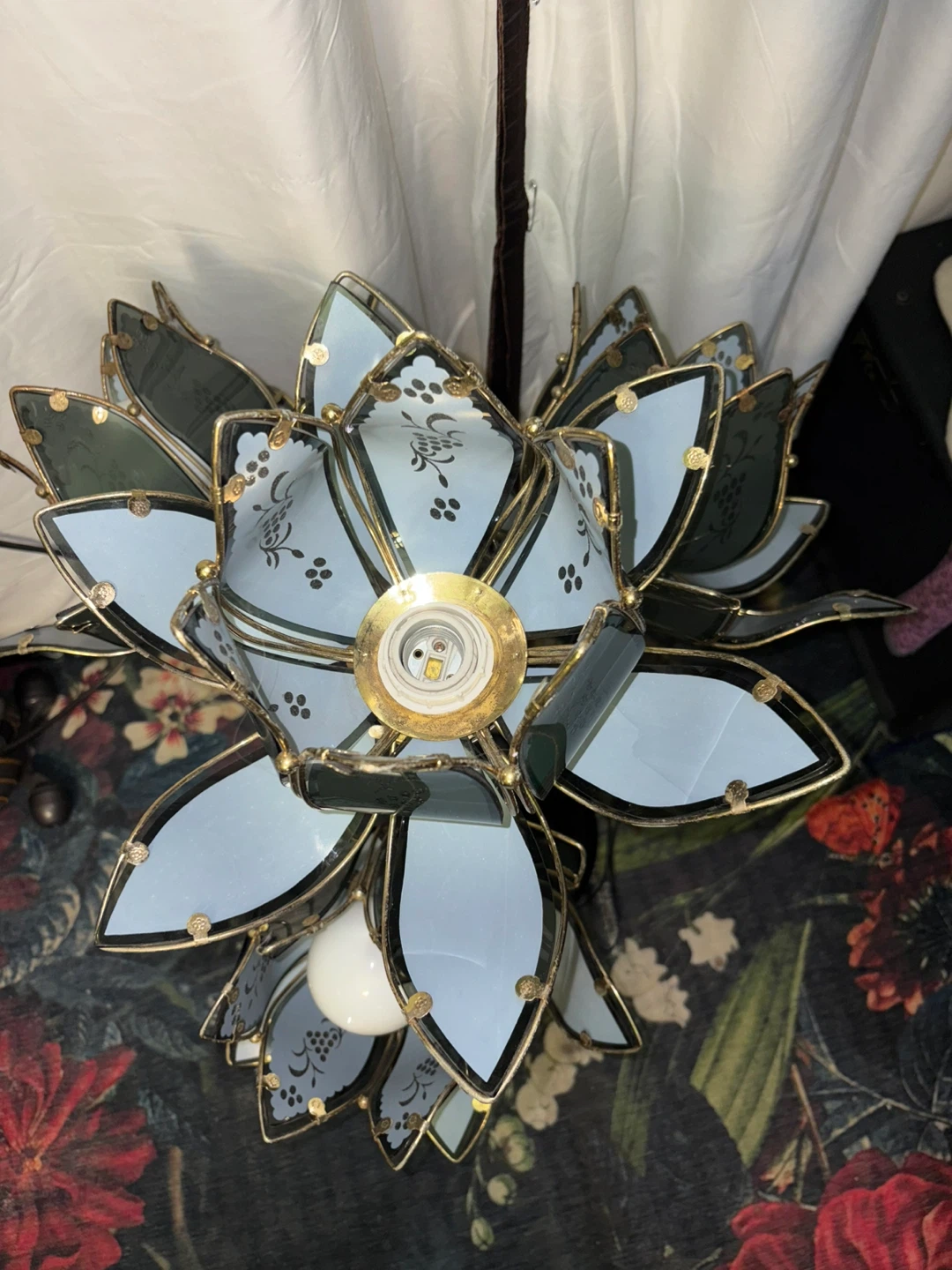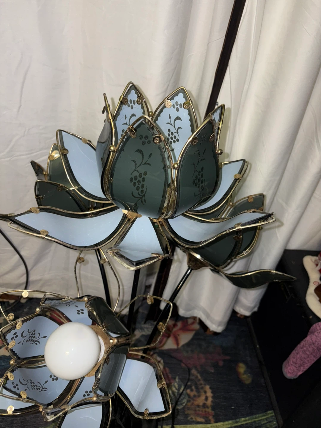 This unique piece is a vintage Hollywood Regency-style lotus lamp from the 1980s. THIS LAMP IS VALUED FROM $470 TO $790. The only flaw is that the children who moved lost three flower petals (replacements are available on Amazon). These lamps were popular in the 1980s and are known for their distinctive flower-shaped glass petals, often featuring a "touch" mechanism to toggle between different light settings.