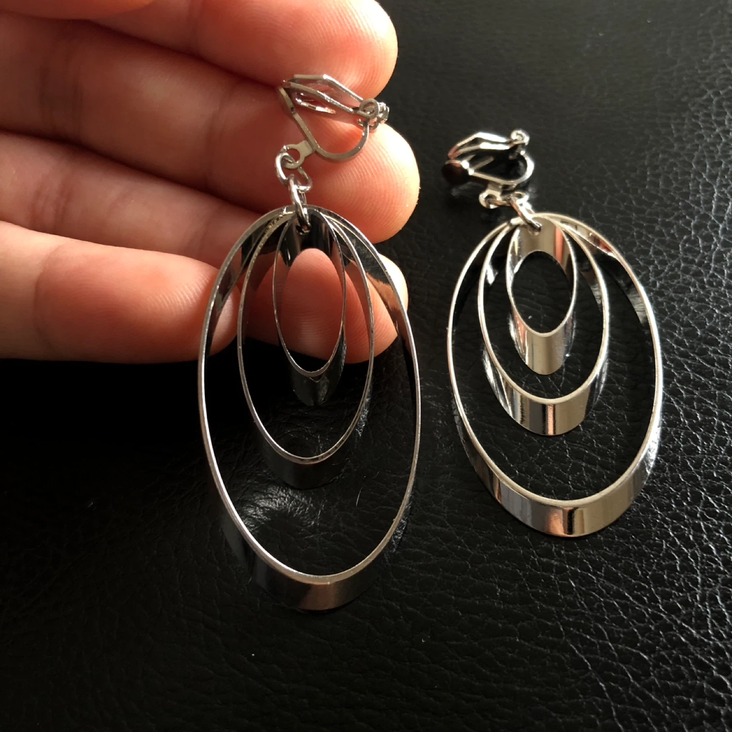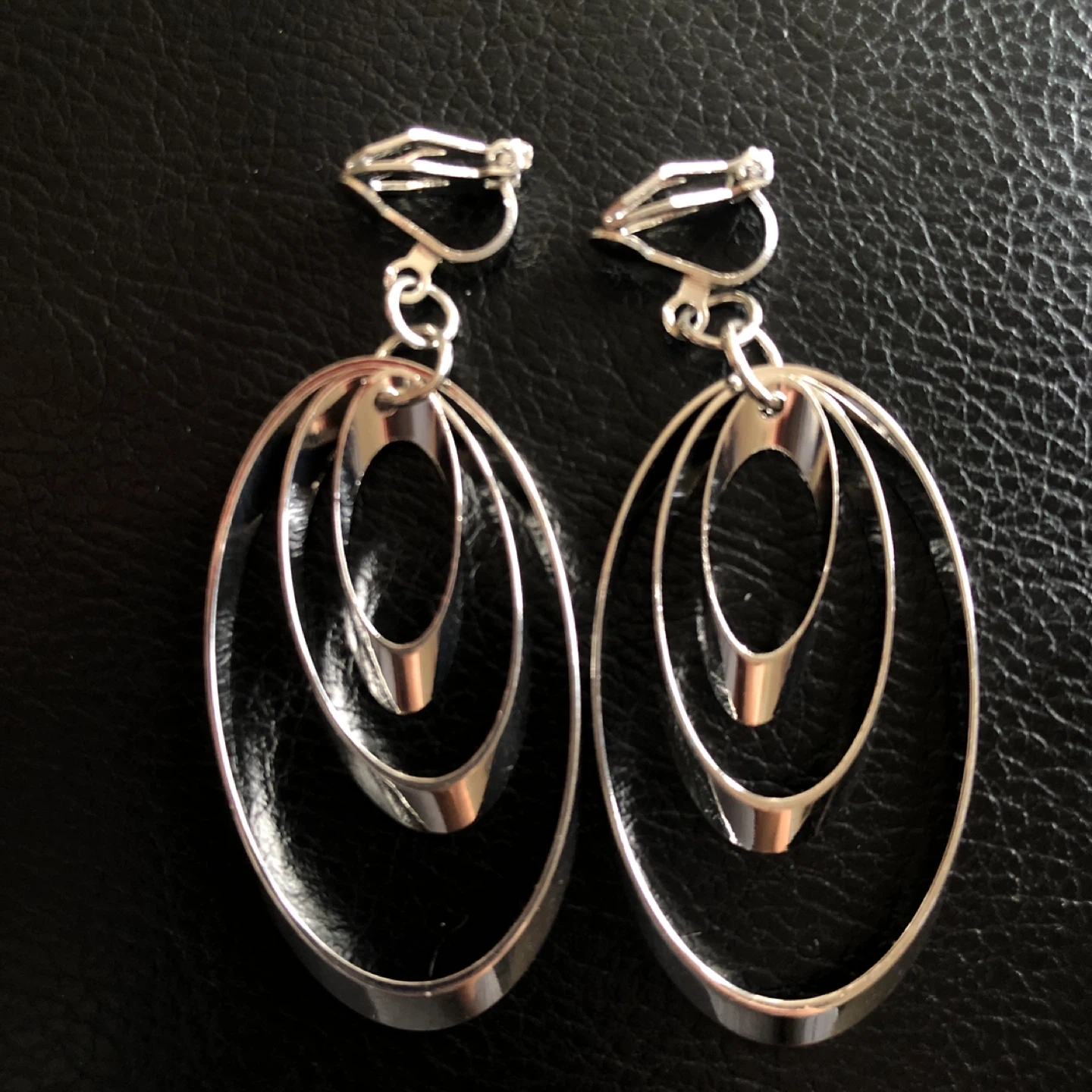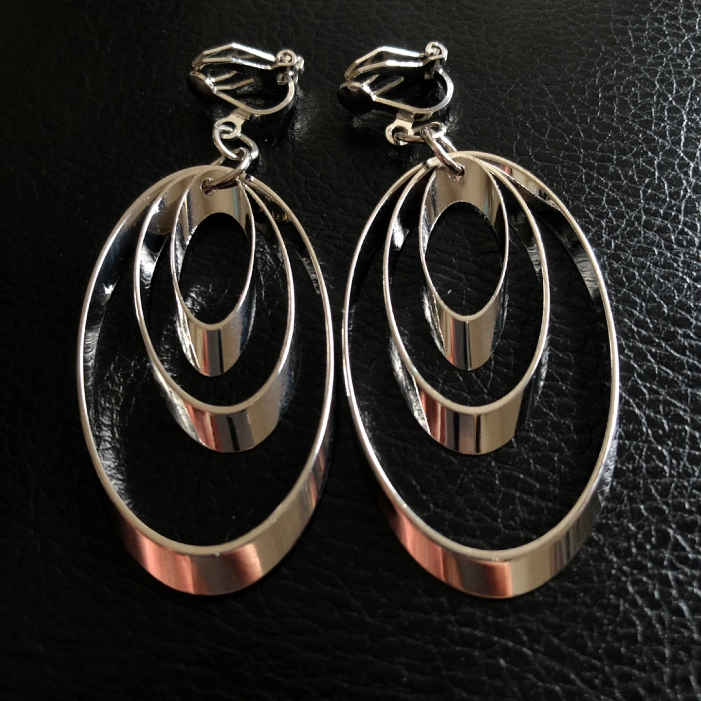 These stylish clip-on earrings feature a graduated oval design. They're made of a shiny silver-tone metal. These are perfect for adding a statement to any outfit!