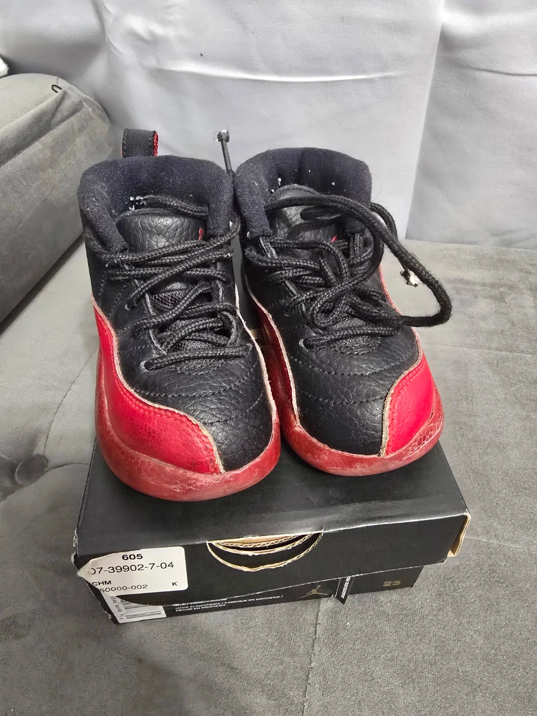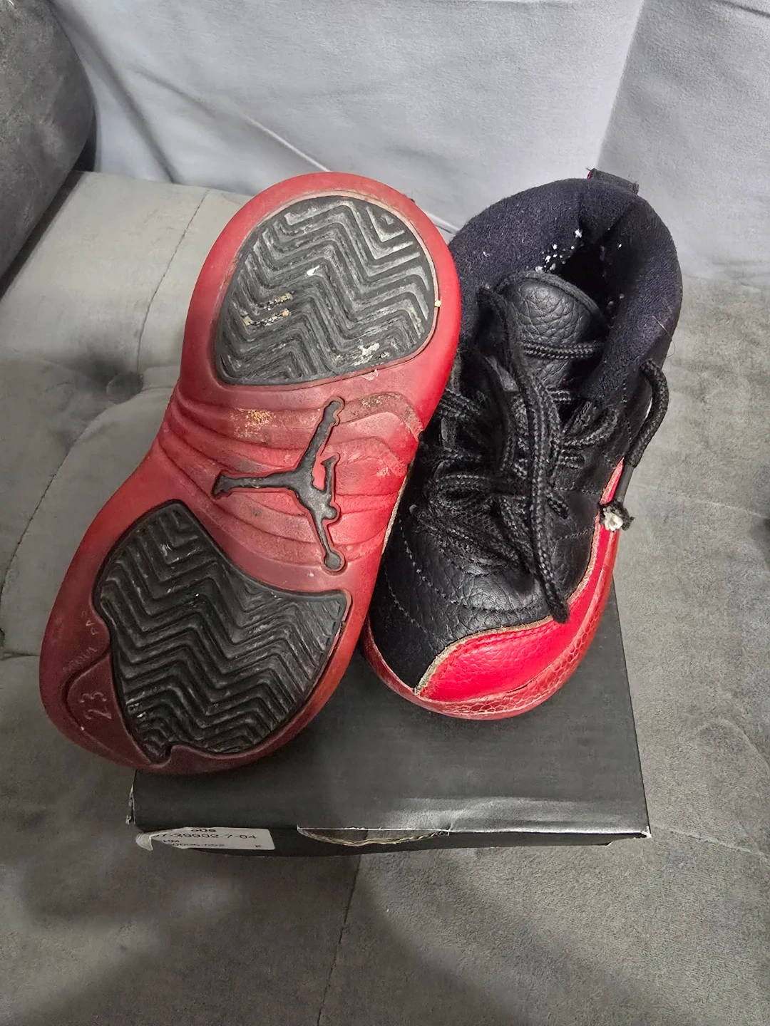 Selling a pair of Jordan 12 Retro toddler shoes in black and red, size 7. They show some signs of wear, but still have lots of life left! Comes with the original box