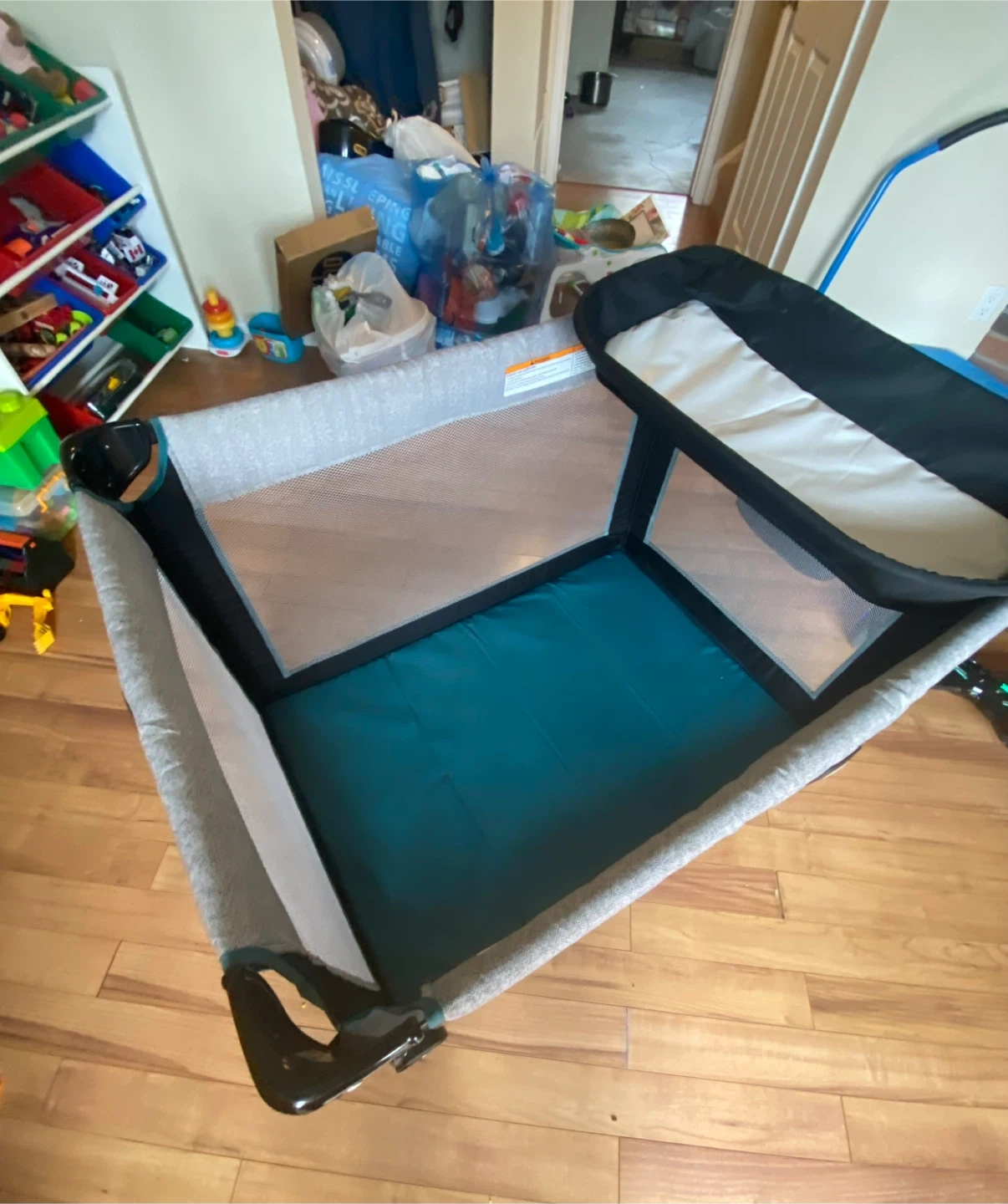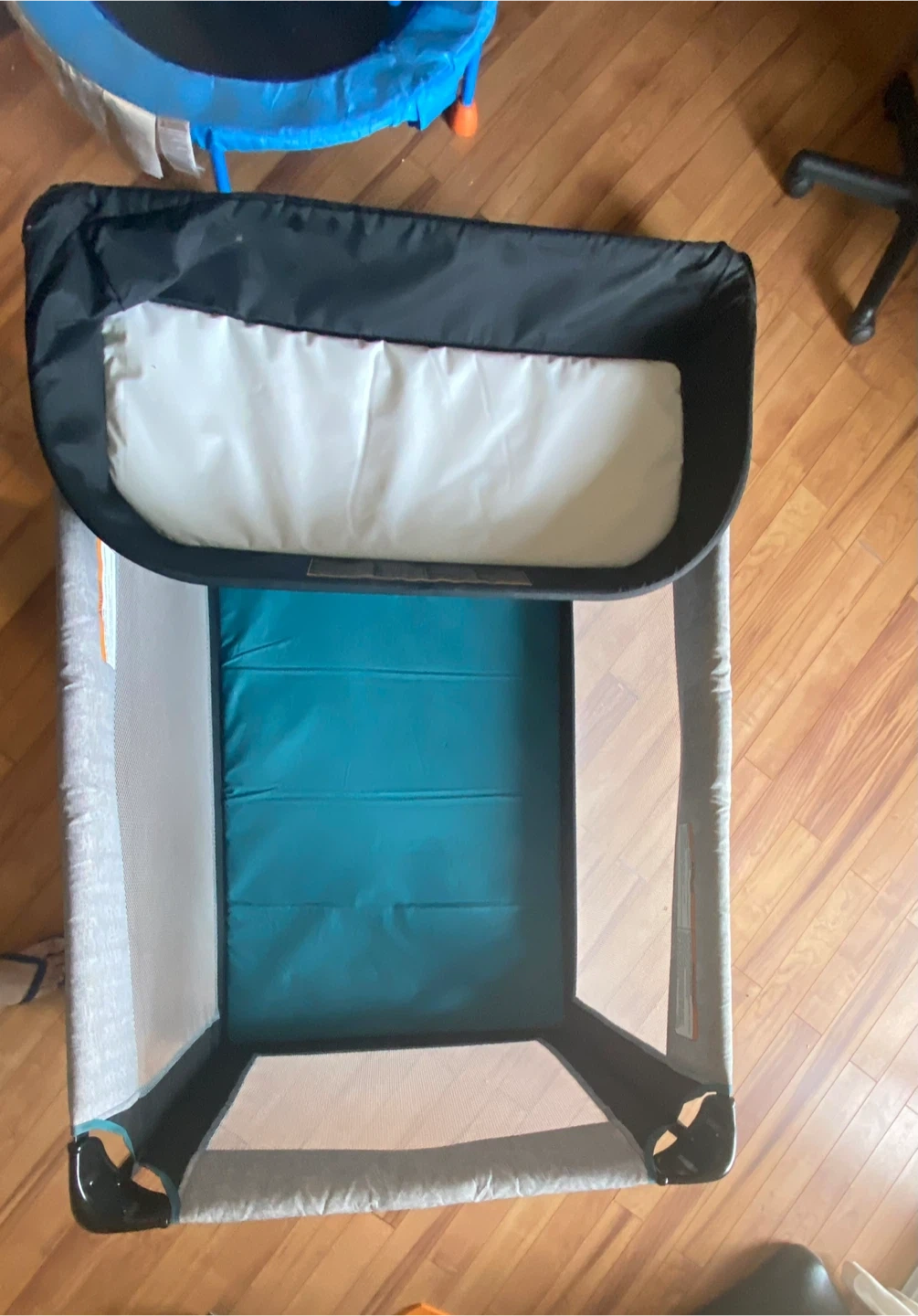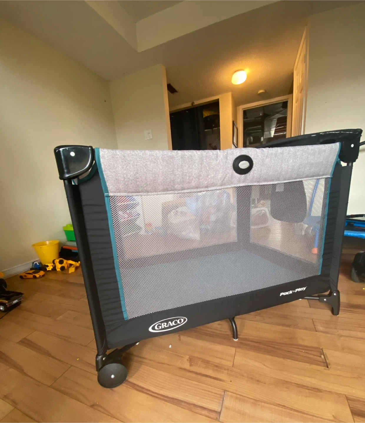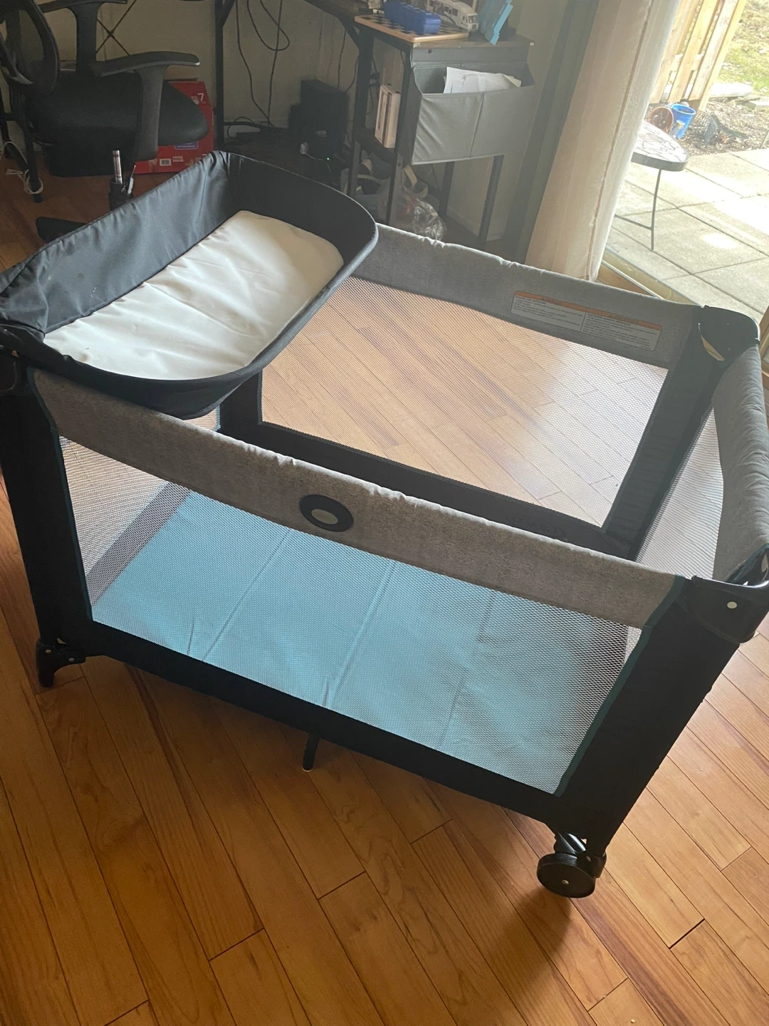 Graco Pack 'n Play portable playard. Includes a bassinet attachment for newborns. Mesh sides for ventilation. Wheels for easy mobility. Folds for storage.Smoke and pet free home