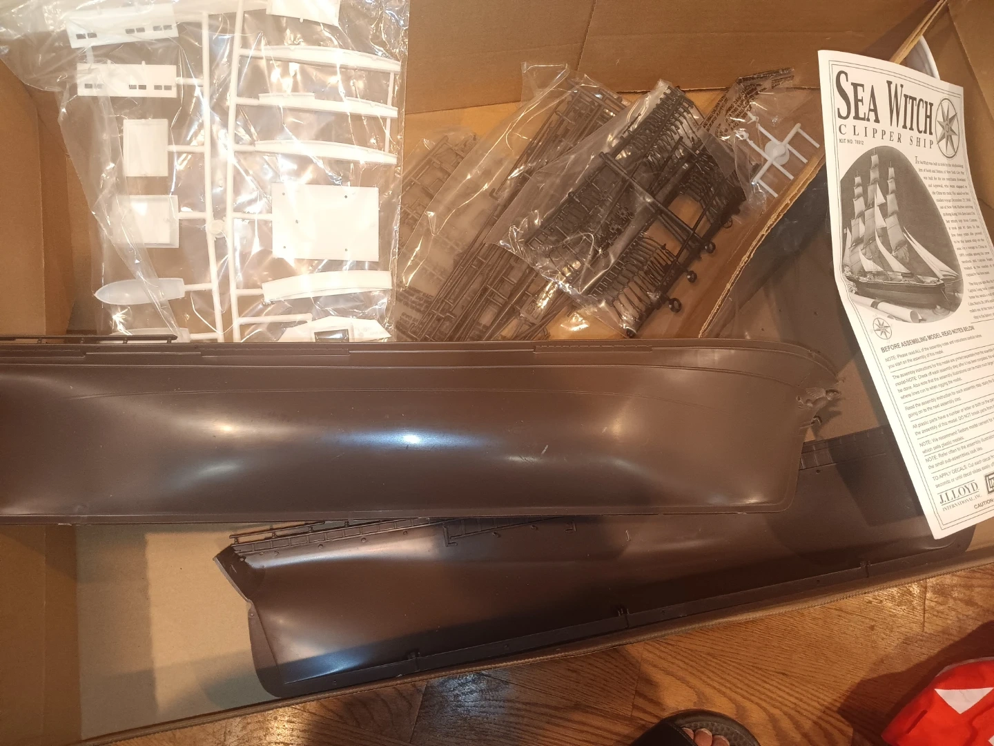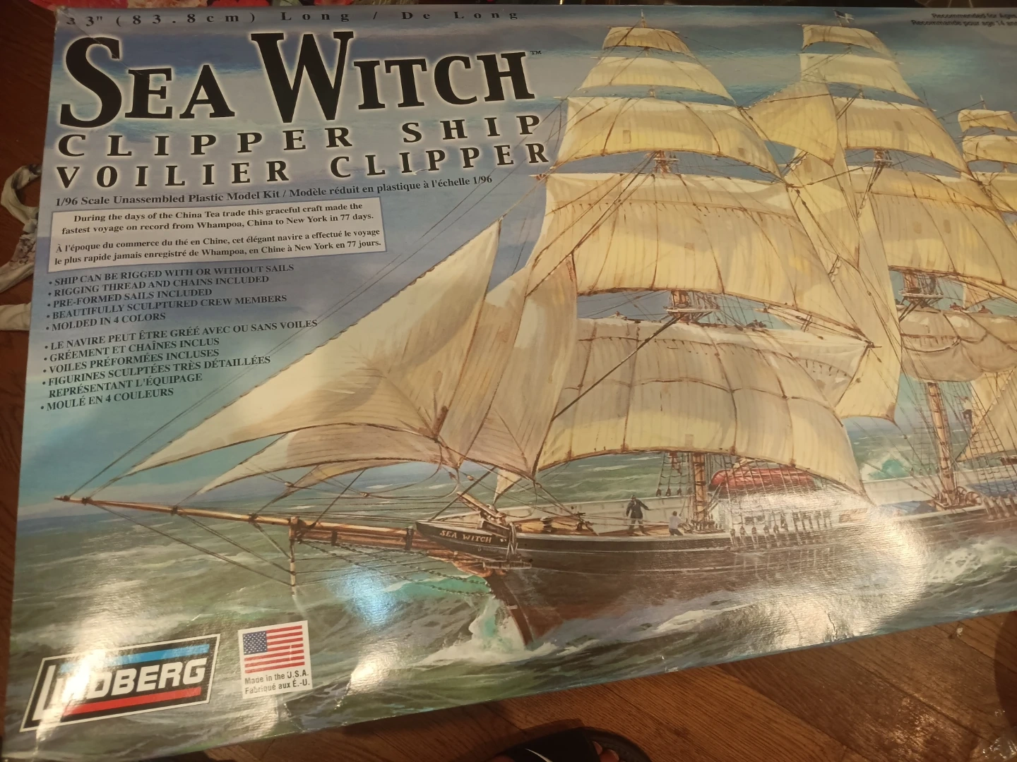 This is the Lindberg Sea Witch Clipper Ship model kit. It's a 1/96 scale un-assembled plastic model. Parts are molded in 4 colors and include rigged sails and rigging. Beautifully sculpted crew members are also included.