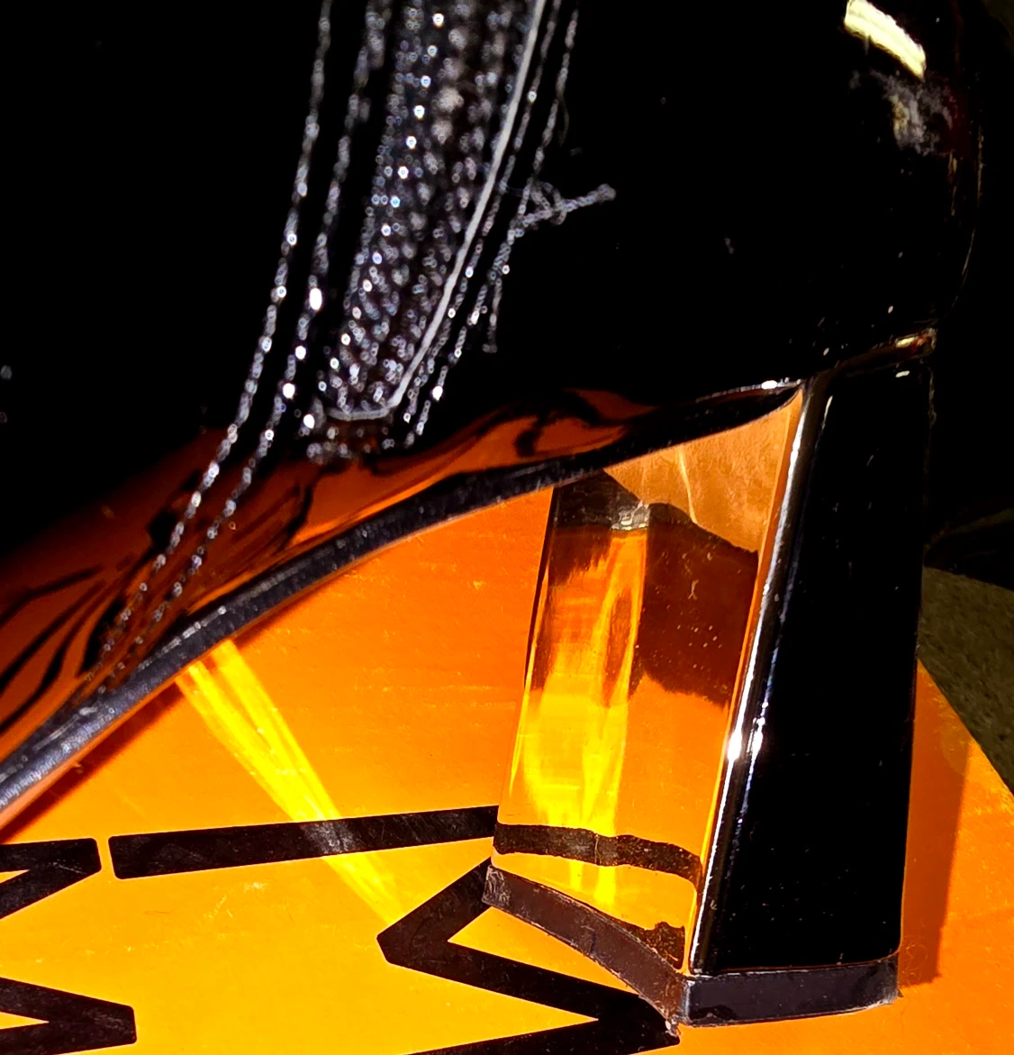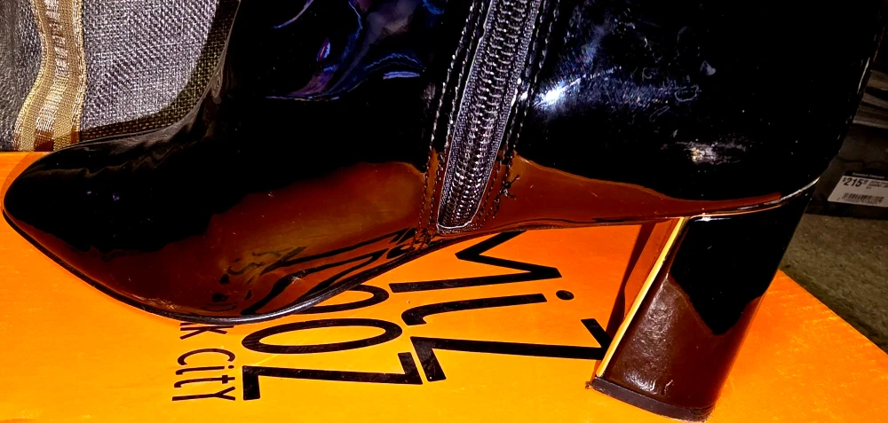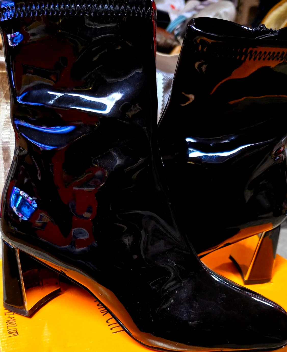 Selling a pair of vogue black patent leather ankle boots with reflective heel! The heel is reflective and a zipper closure. Great to dress up or dress down!