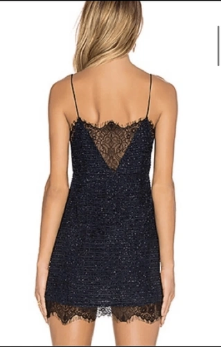 New with tags. The Gio Dress from X by NBD features allover metallic threading and delicate eyelash lace panels at the neckline, along the sides, and hem. Its figure-flattering shape and demure shoulder straps up the grown woman appeal of this sexy mini. Shell & Lining: 96% poly 4% spandex Contrast: 100% viscose Hand wash cold Fully lined Textured metallic woven knit with contrast lace trim panels Side hidden zipper closure Scalloped trim
