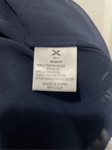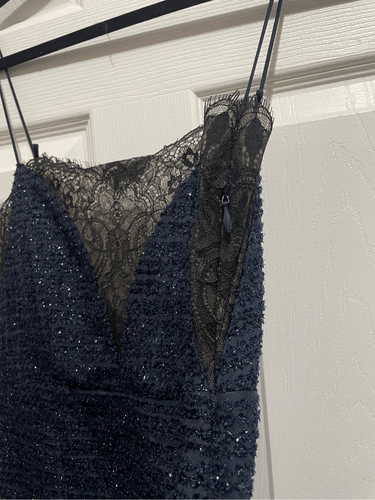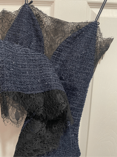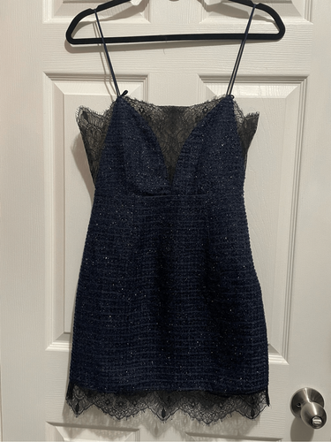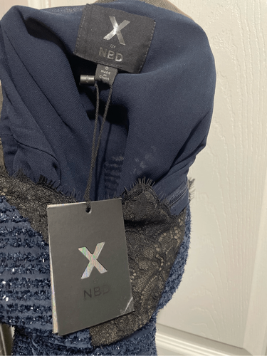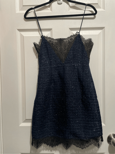 New with tags. The Gio Dress from X by NBD features allover metallic threading and delicate eyelash lace panels at the neckline, along the sides, and hem. Its figure-flattering shape and demure shoulder straps up the grown woman appeal of this sexy mini. Shell & Lining: 96% poly 4% spandex Contrast: 100% viscose Hand wash cold Fully lined Textured metallic woven knit with contrast lace trim panels Side hidden zipper closure Scalloped trim