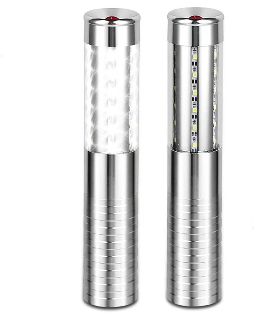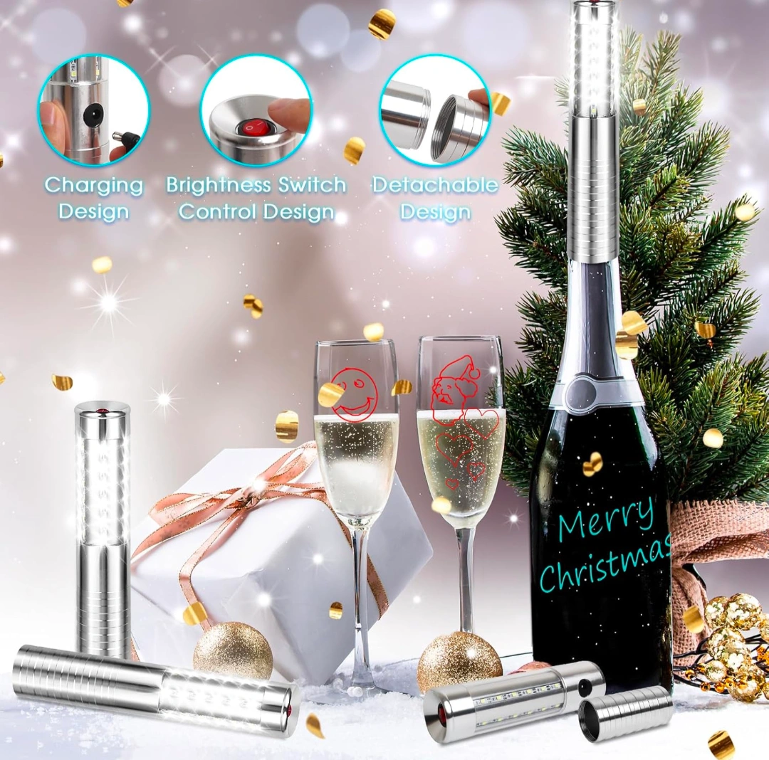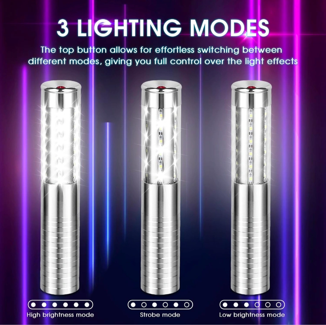 Rechargeable LED bottle lights. Three lighting modes: high brightness, strobe, and low brightness. Silver metal casing. Detachable design. Includes USB charging. Pack of 2