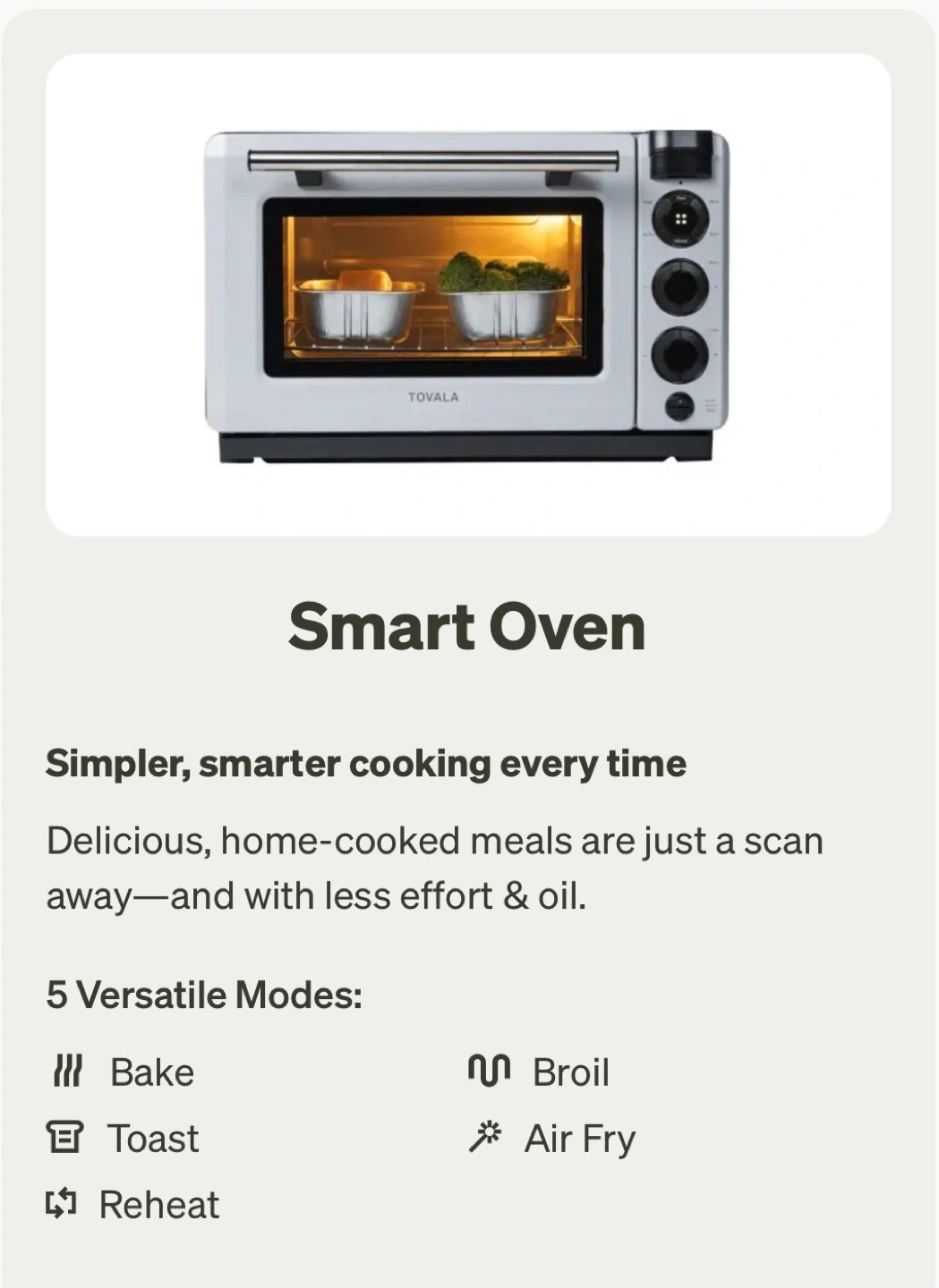 This Tovala Smart Oven offers simpler, smarter cooking with 5 versatile modes: Bake, Toast, Reheat, Broil, and Air Fry. It's designed for delicious, home-cooked meals with less effort.