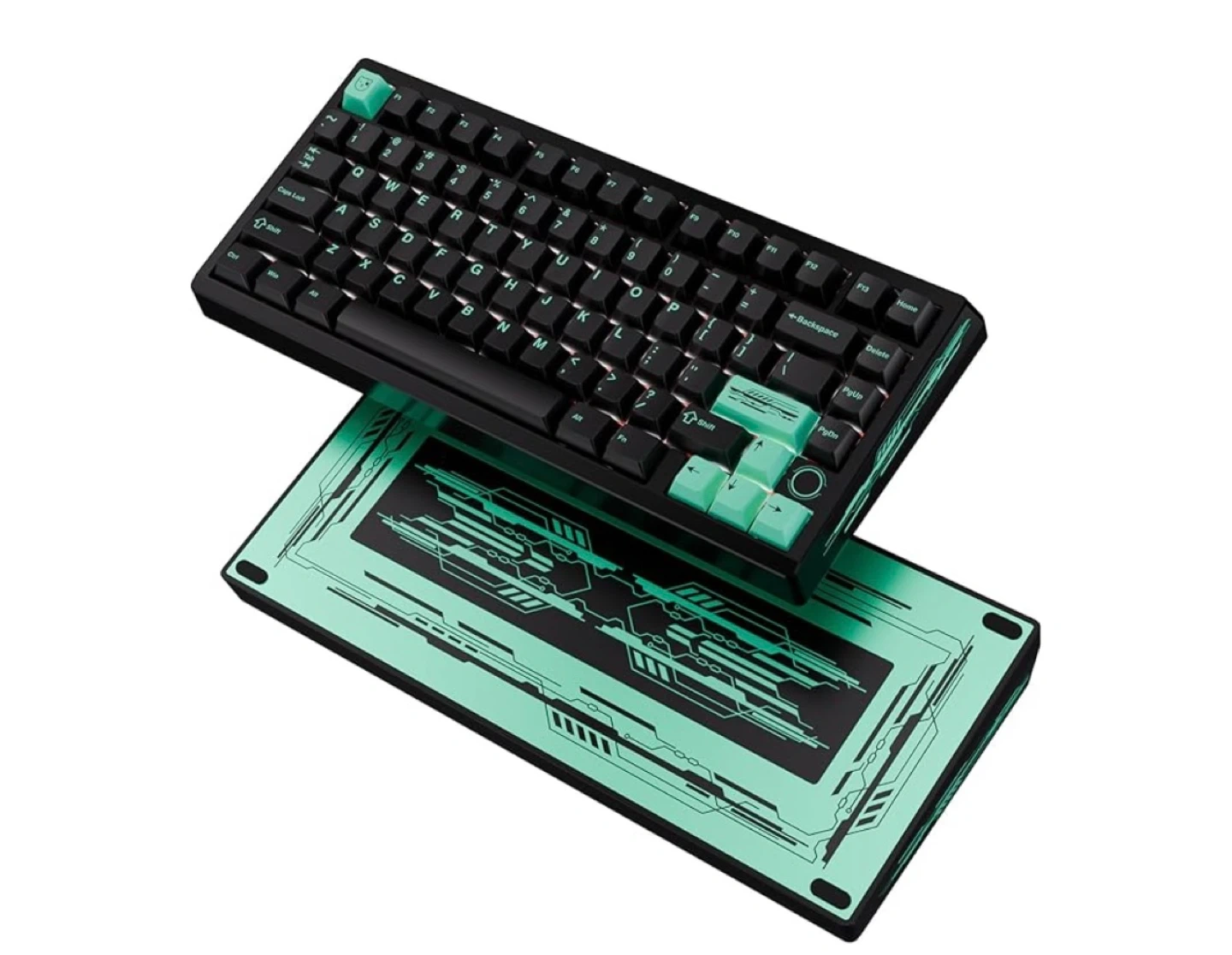 This is a black mechanical keyboard featuring mint green keycaps. It has a compact layout and a sleek design. The keyboard includes a decorative base with a matching mint green circuit board design.