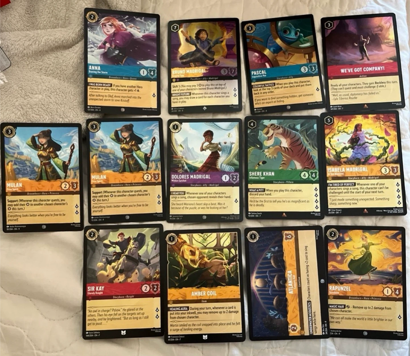 Selling a set of Disney Lorcana trading cards! Includes characters like Anna, Bruno Madrigal, Mulan, and Rapunzel. Great for fans of Disney and trading card games