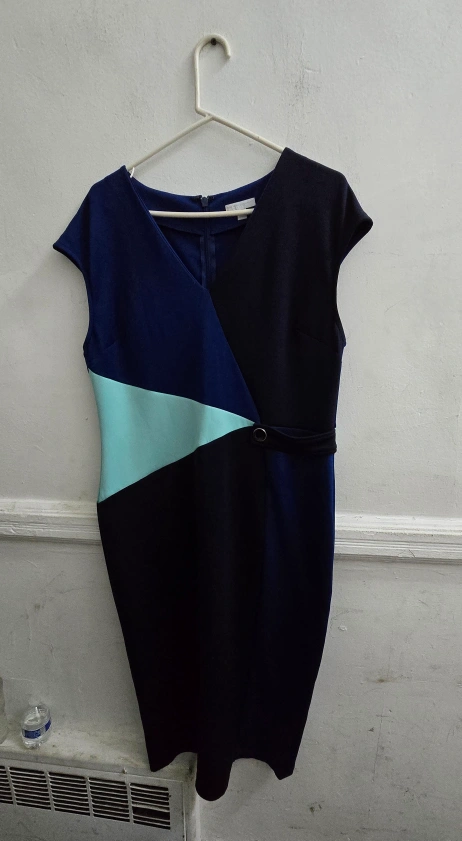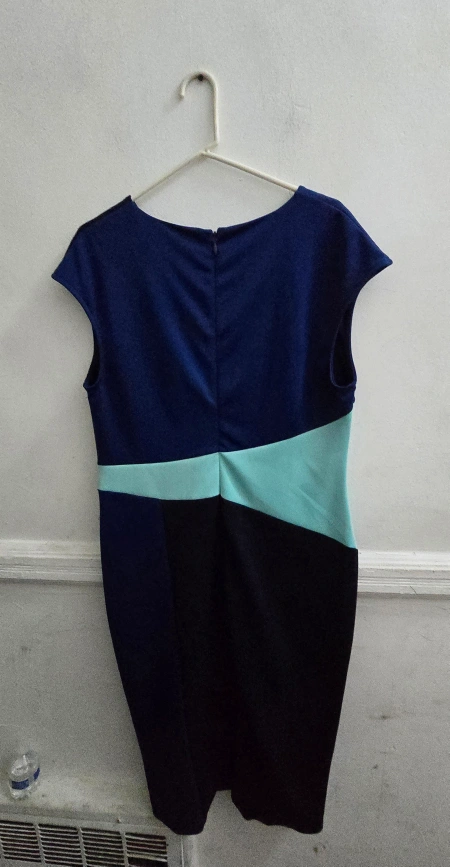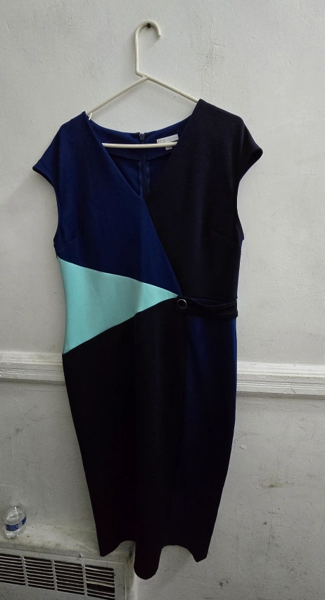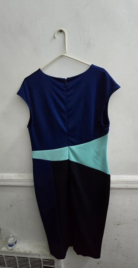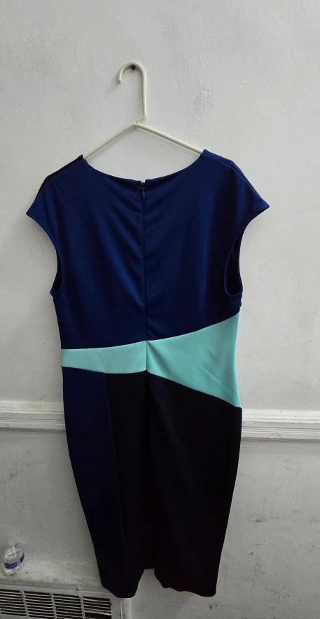 This dress features a stylish color block design with navy blue, black, and a touch of light blue. It's in great condition and ready for a new home!