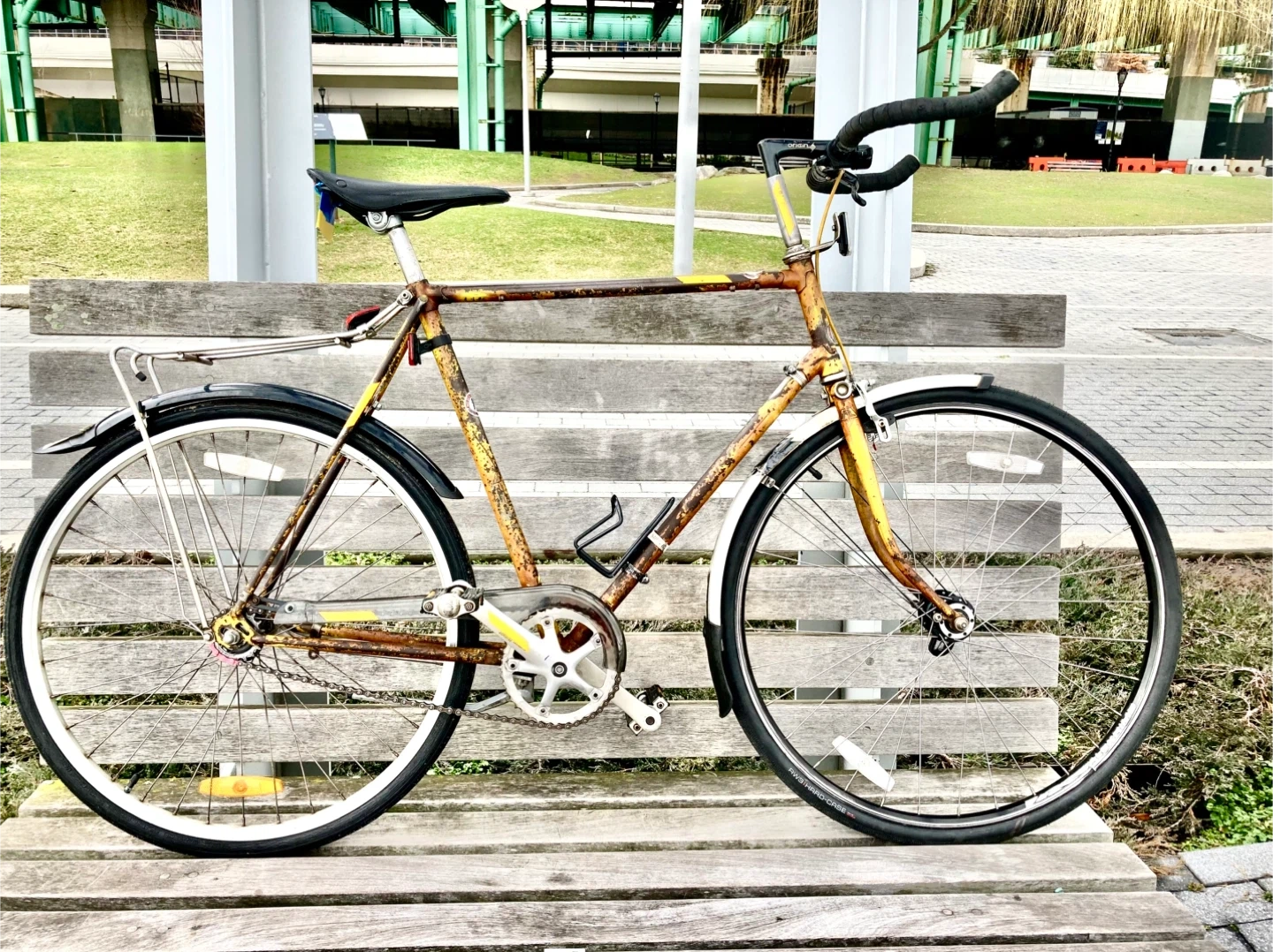This is a classic English Raleigh bicycle with original paint and decals. It features a classic steel frame design 58cm, fast, single gear, with kickstand, fenders, chain guard, water bottle cage, rear rack.