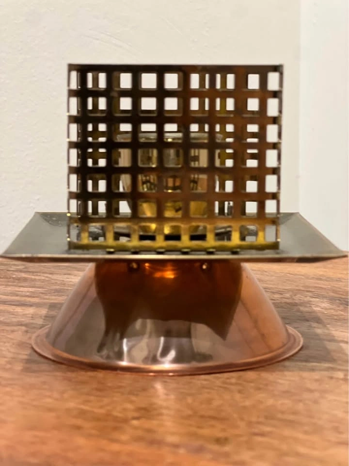 This is a vintage Brutalist brass candle holder with a unique geometric design. It features a central cup for a candle or small vessel, supported by two decorative, lattice-like pillars on a raised square platform and a conical copper or brass base. The piece is consistent with Mid-Century Modern and Brutalist design movements from the 1950s to 1970s. It is primarily constructed from heavy, polished, or patinated brass and copper. The architectural, cage-like pillars and solid, geometric forms are characteristic of artistic metalwork from this period. Preowned. Pickup is 58th and 7th Ave in midtown Manhattan.