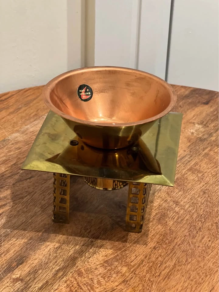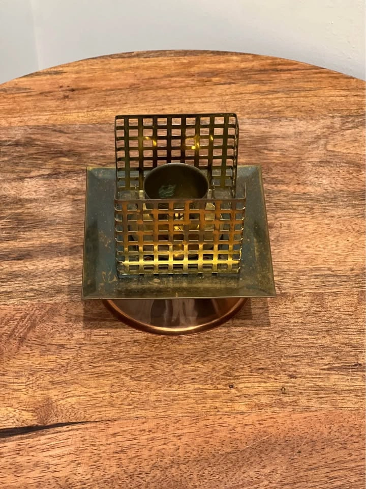This is a vintage Brutalist brass candle holder with a unique geometric design. It features a central cup for a candle or small vessel, supported by two decorative, lattice-like pillars on a raised square platform and a conical copper or brass base. The piece is consistent with Mid-Century Modern and Brutalist design movements from the 1950s to 1970s. It is primarily constructed from heavy, polished, or patinated brass and copper. The architectural, cage-like pillars and solid, geometric forms are characteristic of artistic metalwork from this period. Preowned. Pickup is 58th and 7th Ave in midtown Manhattan.