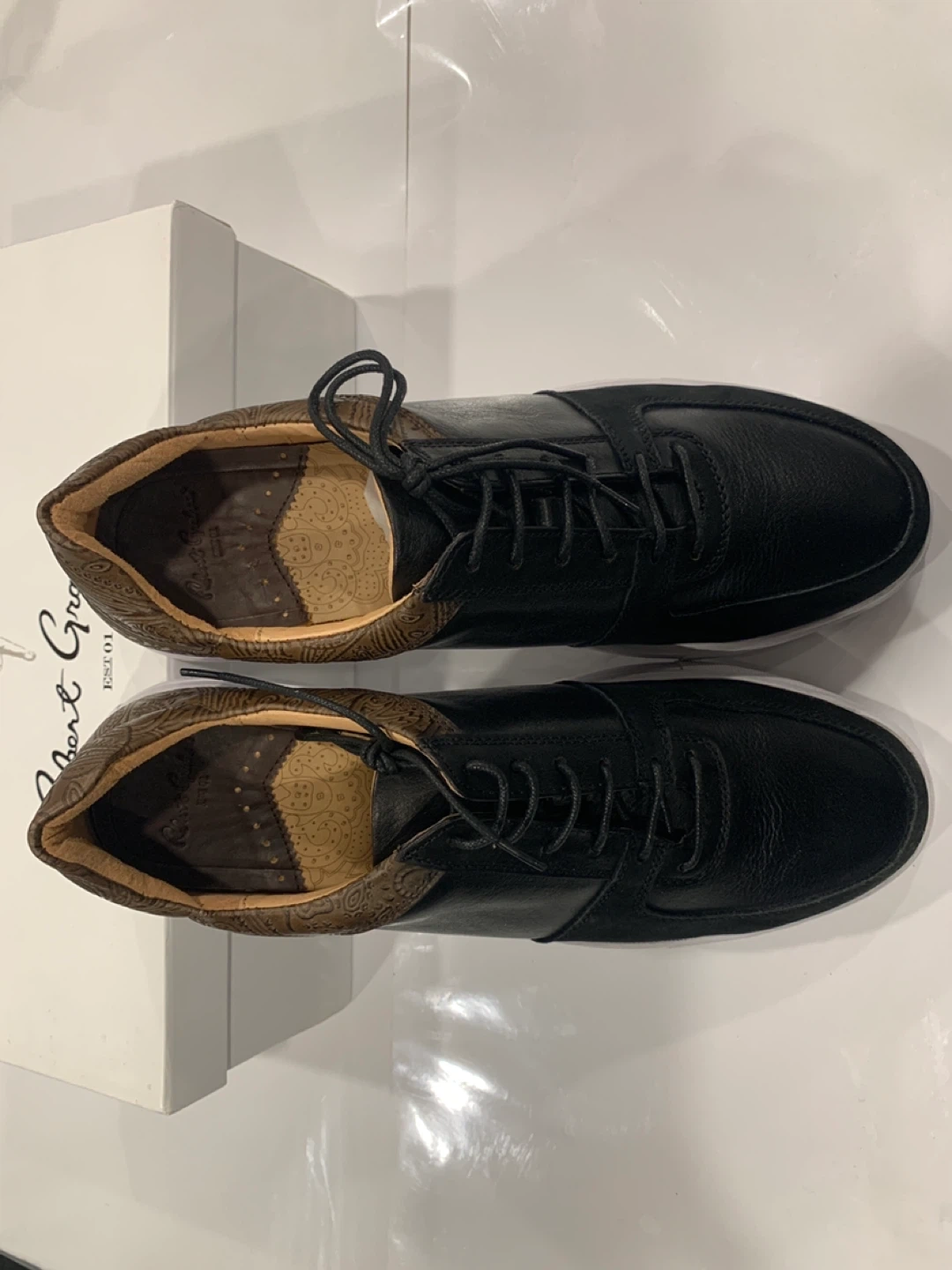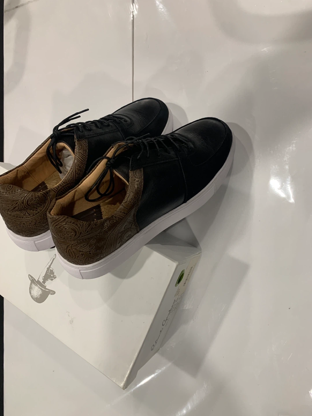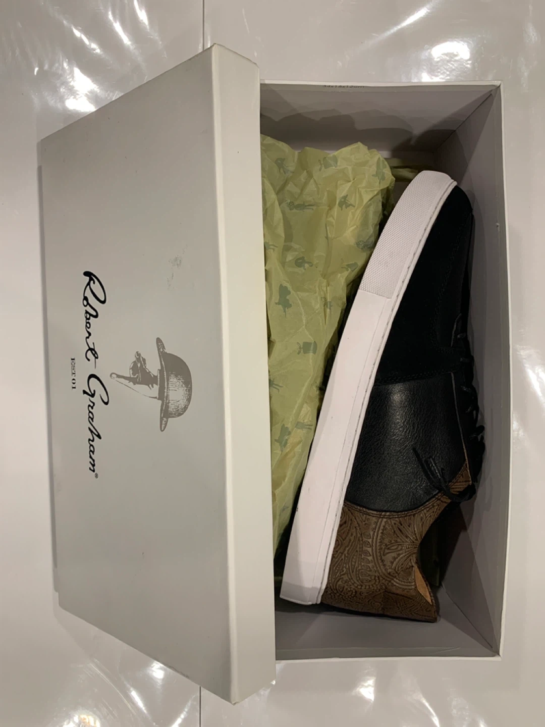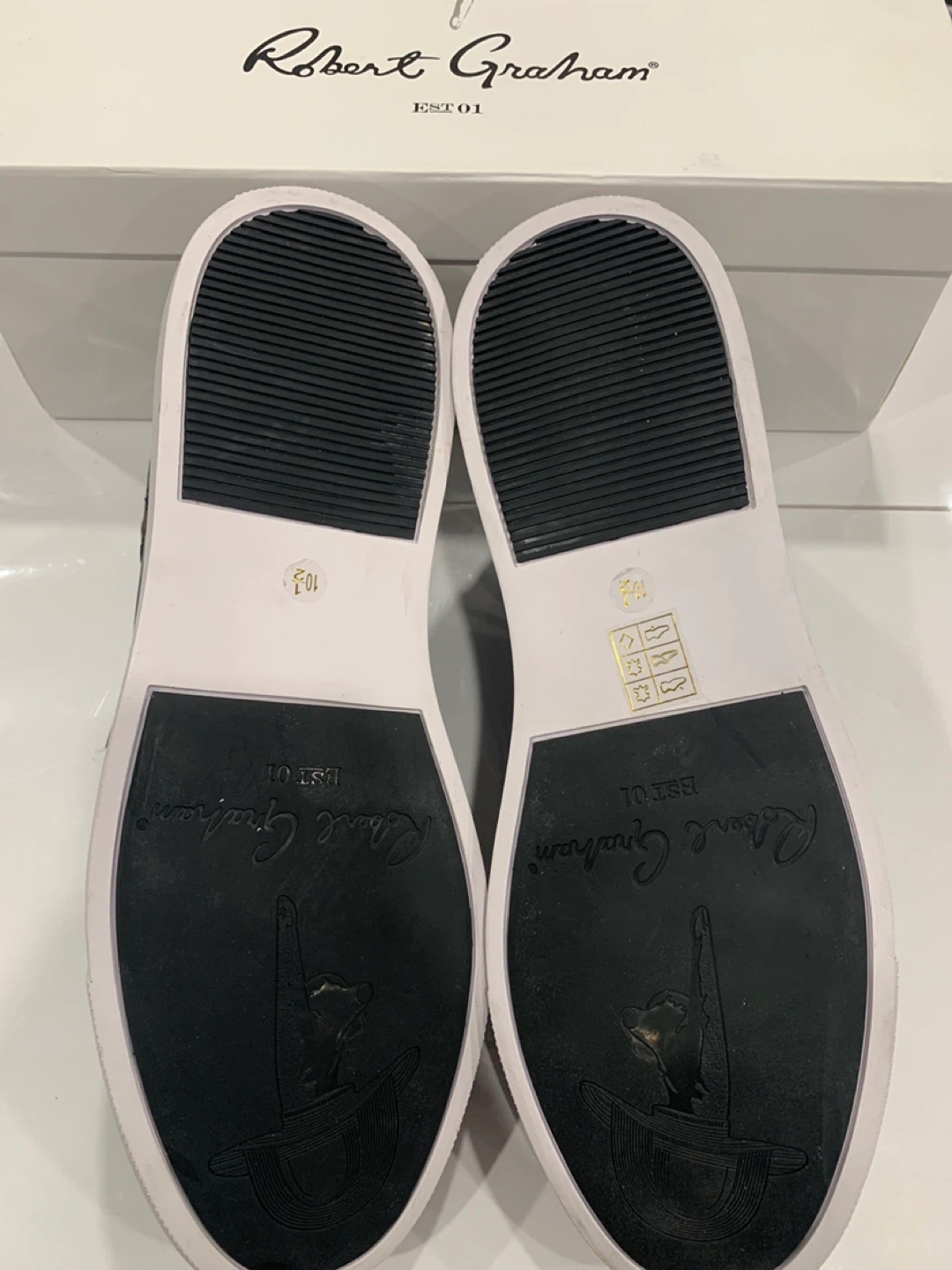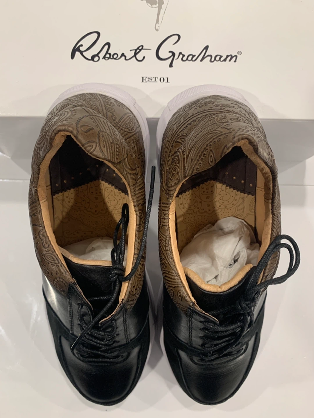 Selling a pair of Robert Graham leather sneakers. They are black with a unique brown paisley pattern on the heel. Size 10.5. Comes with the original box!