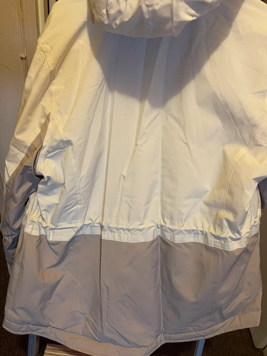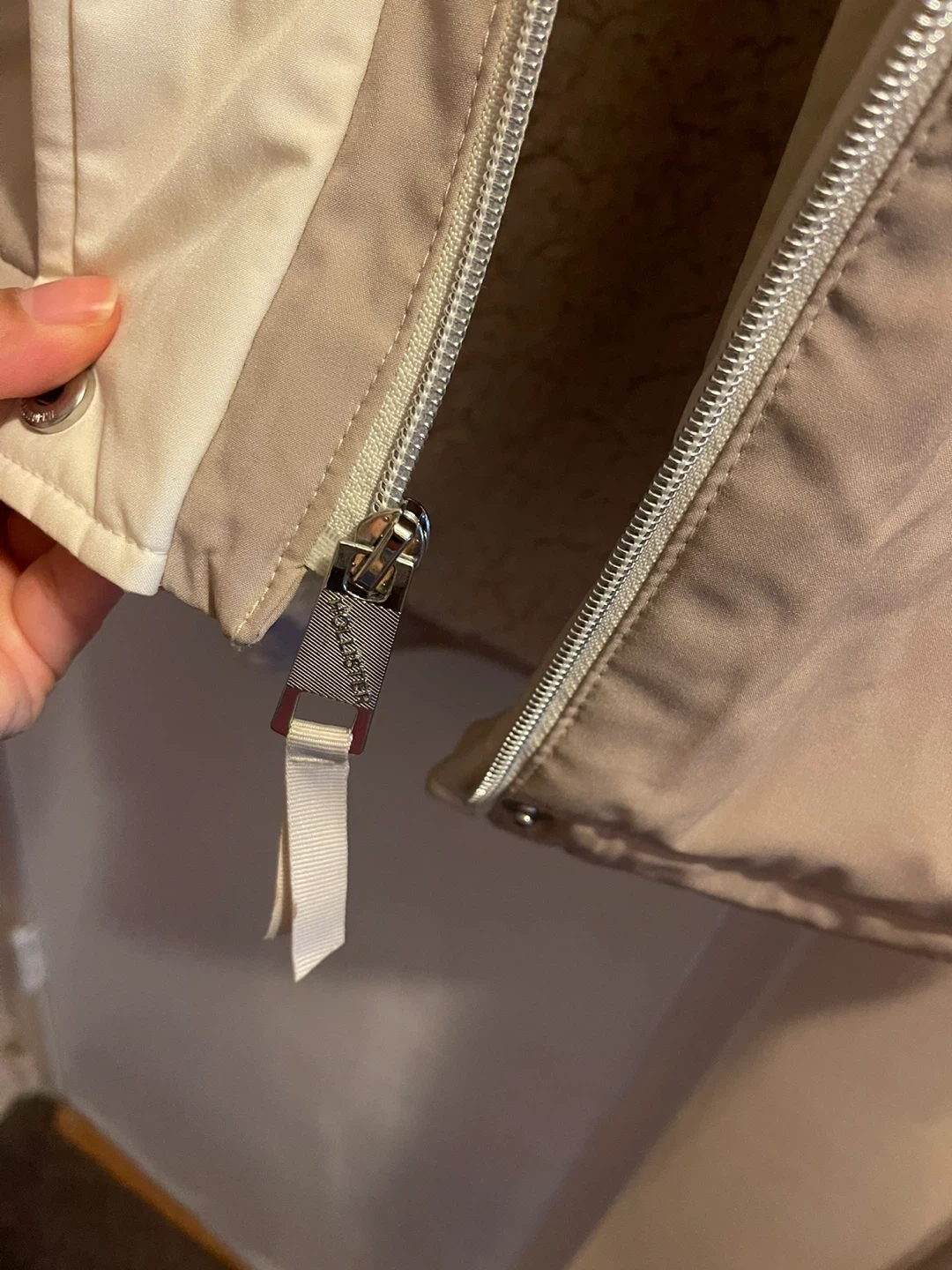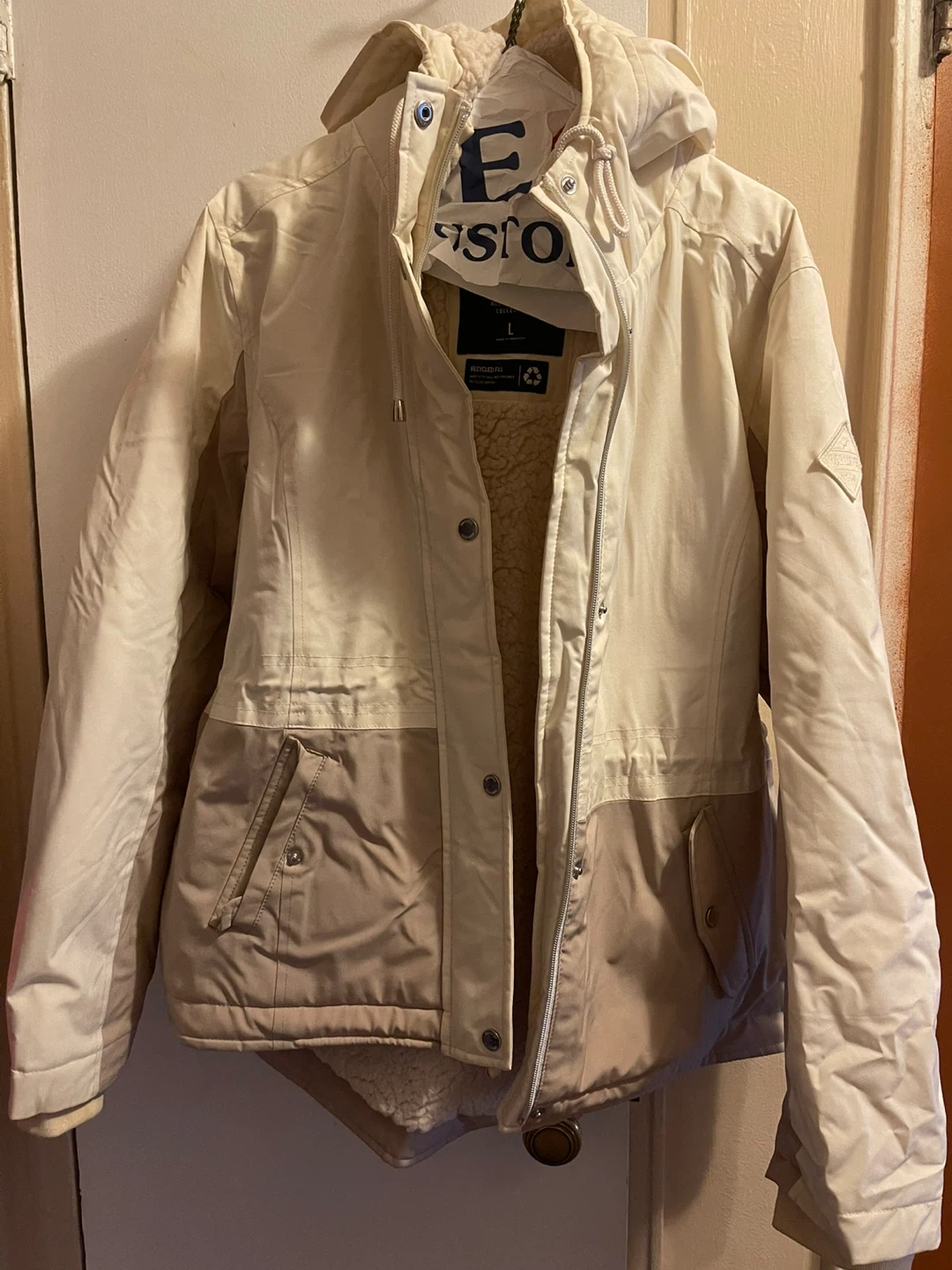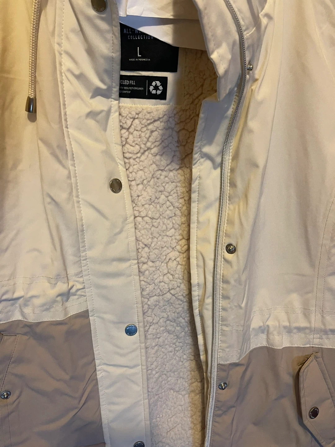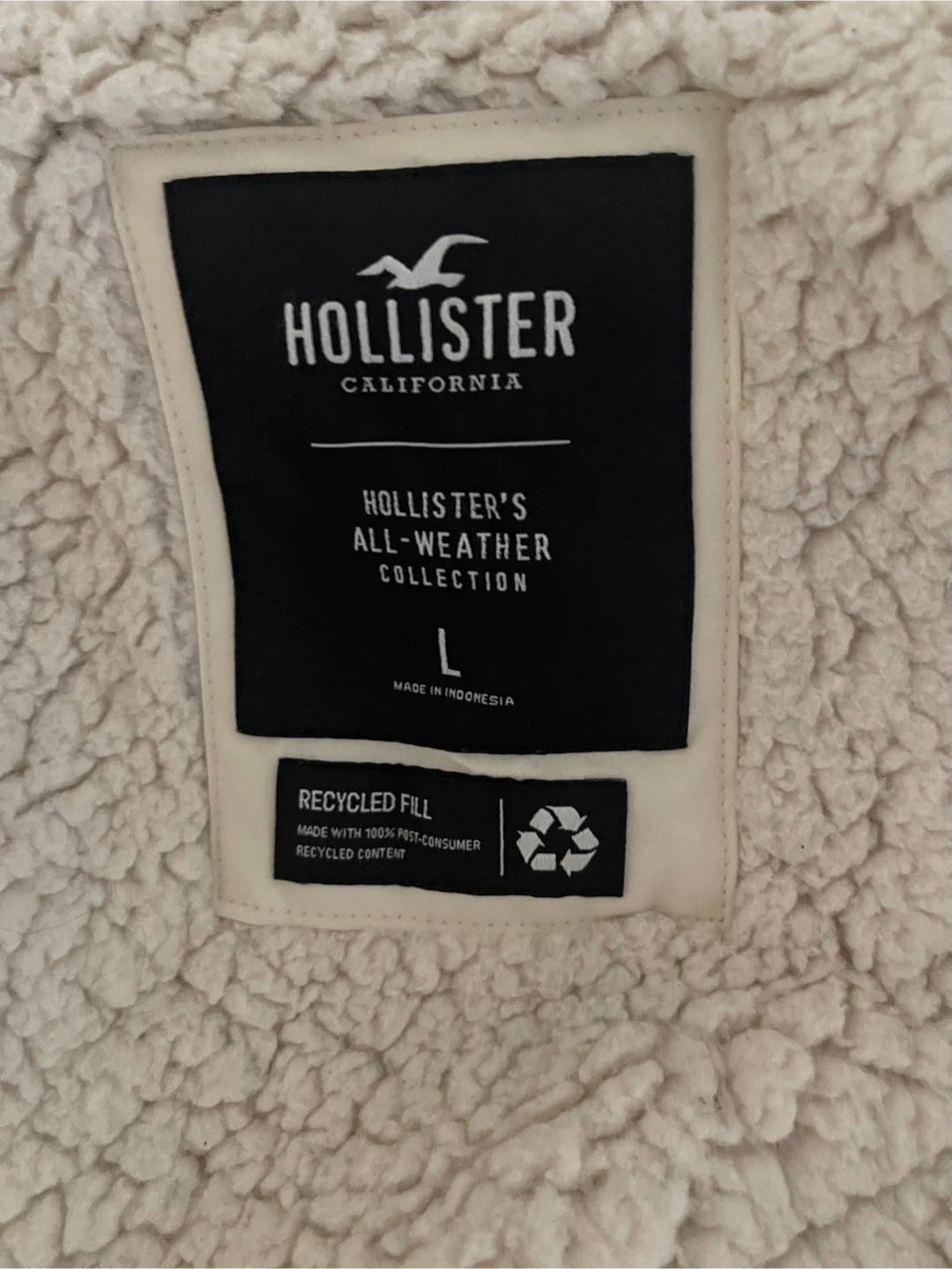 This is a Hollister All-Weather Collection jacket in size L. It's made with recycled fill and features a cozy sherpa lining. The outer shell is a blend of cream and tan colors.