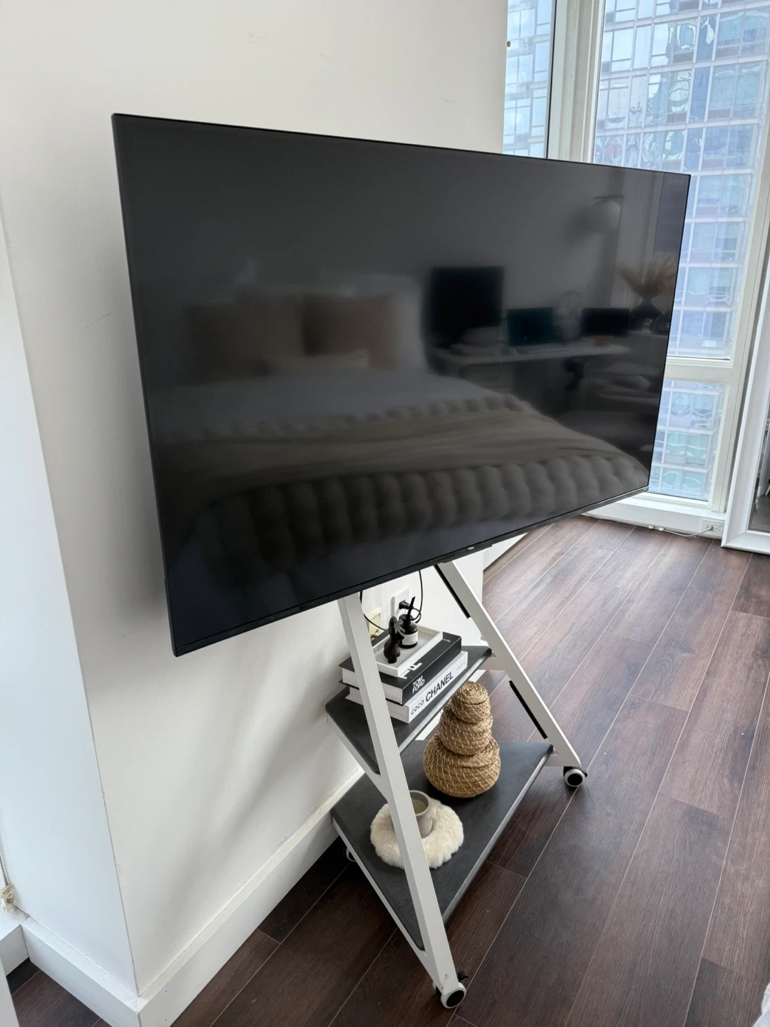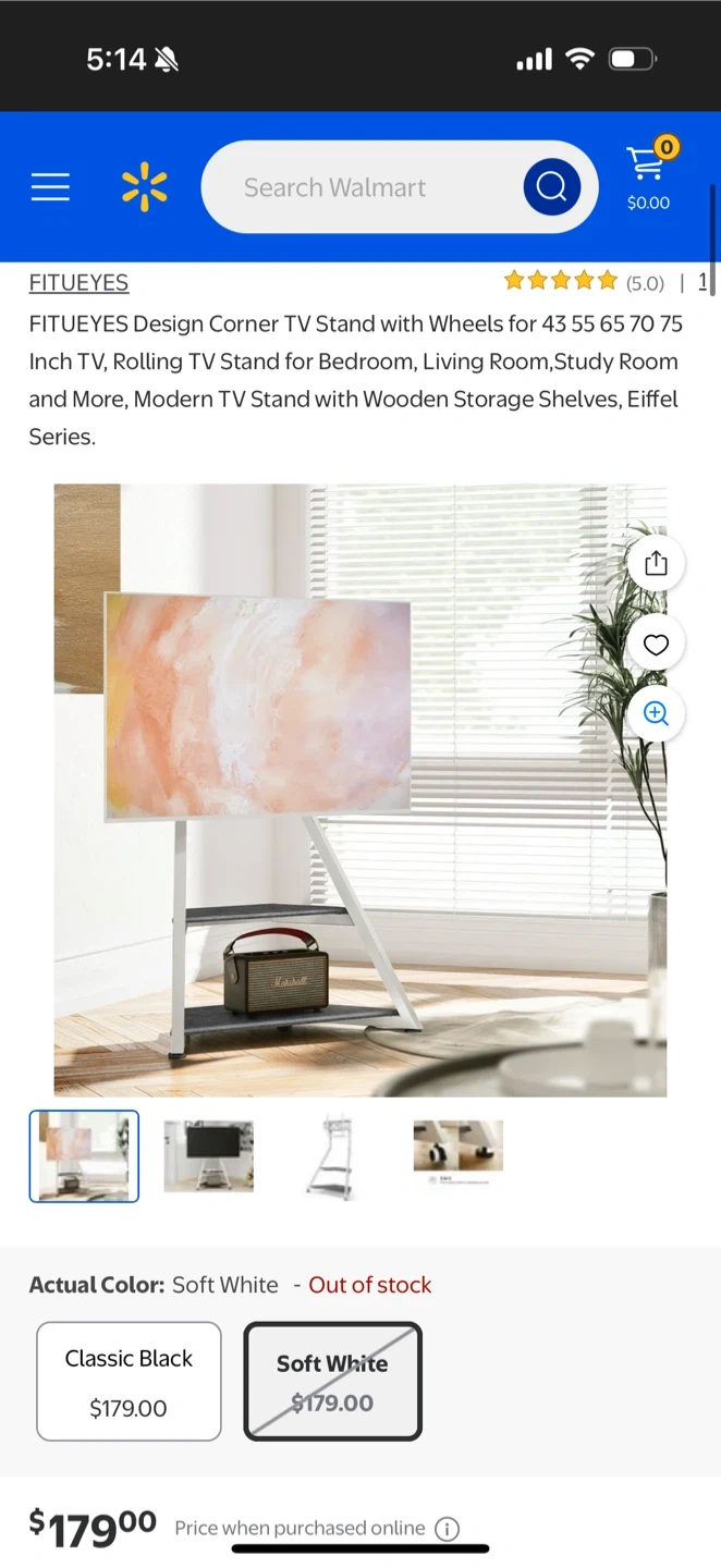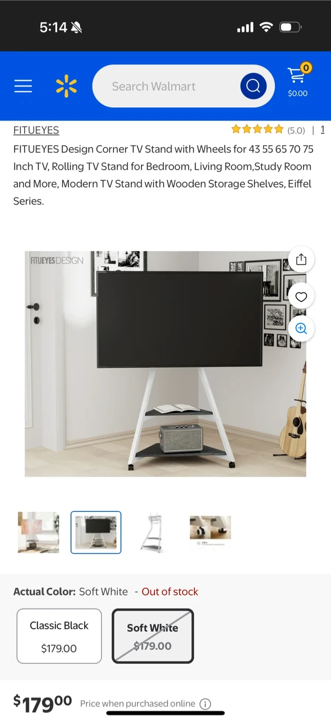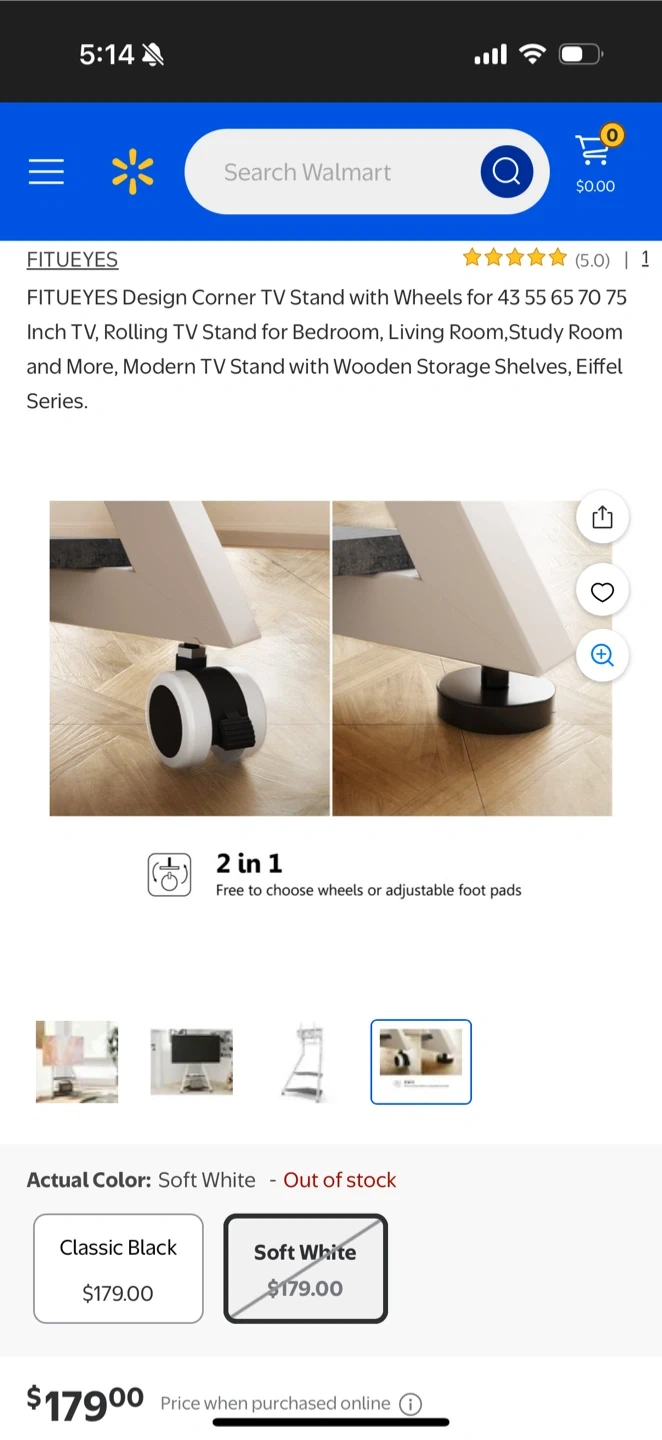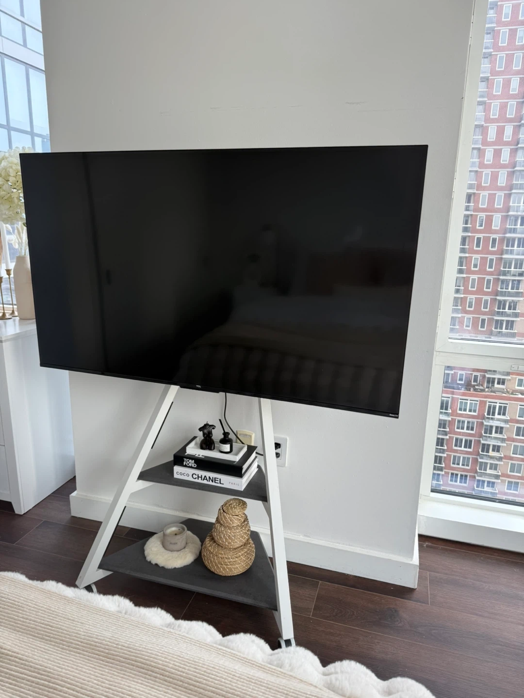 This FITUEYES TV stand supports 43 to 75 inch TVs and features rolling wheels for easy movement. It has two storage shelves made of wood. The stand's color is soft white
