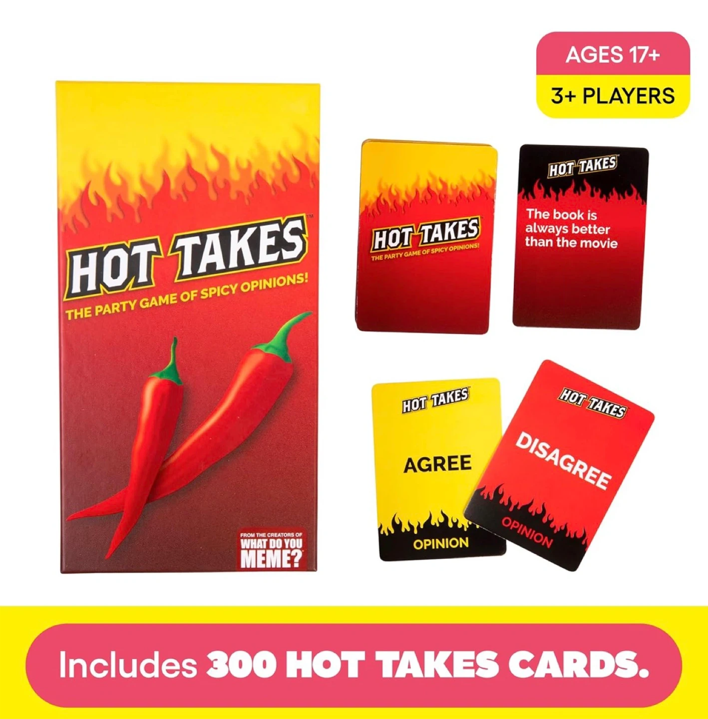 It's the party game of spicy opinions, created by the minds behind What Do You Meme? This game includes 300 Hot Takes cards for players ages 17 and up. It's perfect for game nights with friends or family!