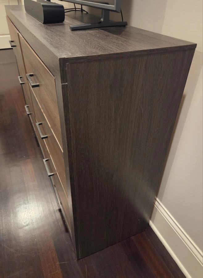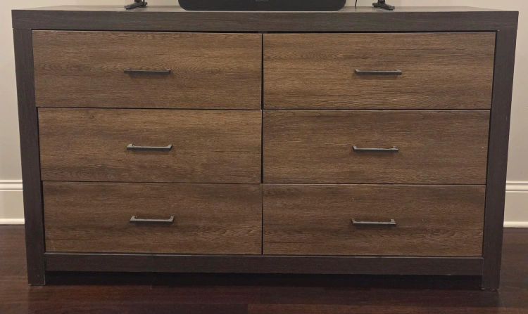 Here's a wood dresser with six drawers. It's sturdy and provides ample storage space. The dresser features a two-tone wood finish and is in good condition.