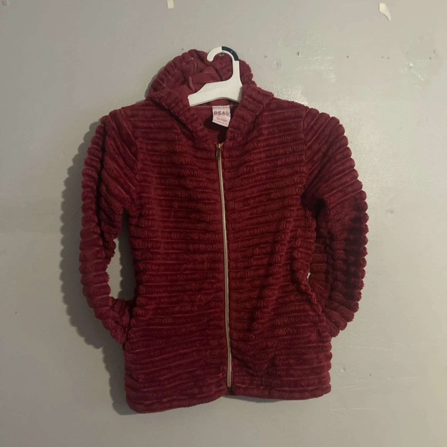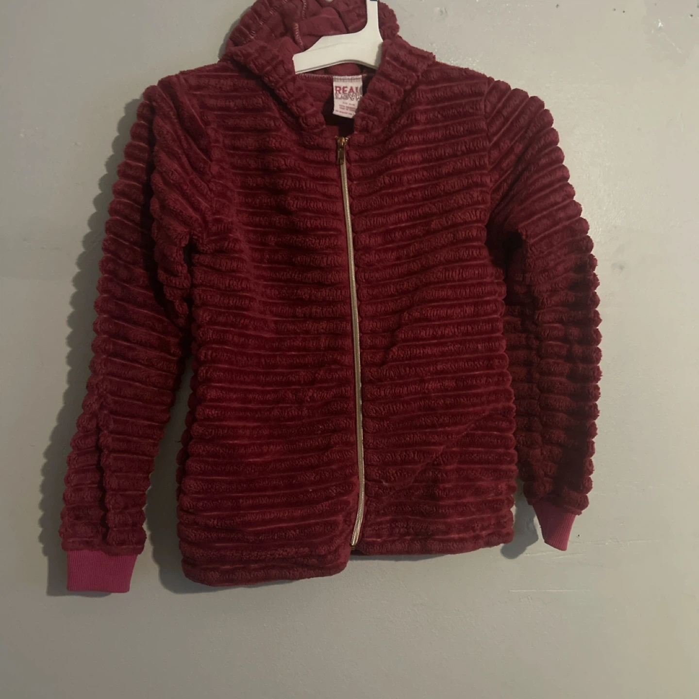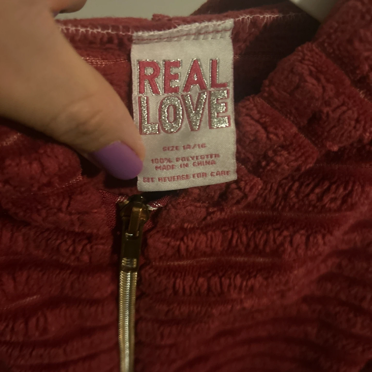 Selling a cute and cozy girl's burgundy fleece hoodie from Real Love! It's a size 14/16 and made of 100% polyester. Perfect for keeping warm on chilly days