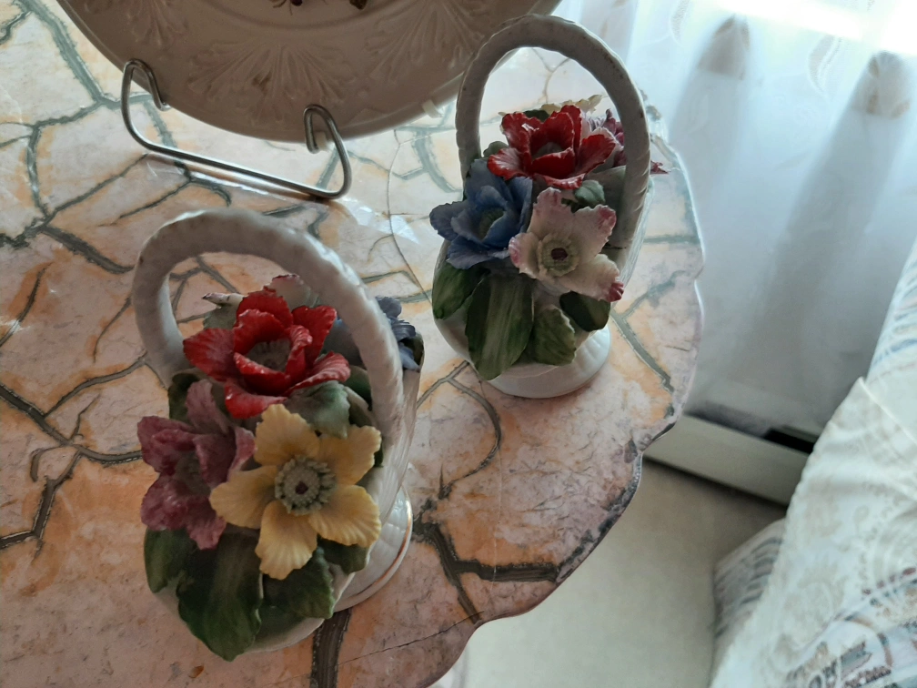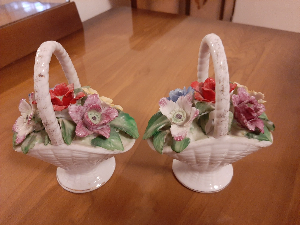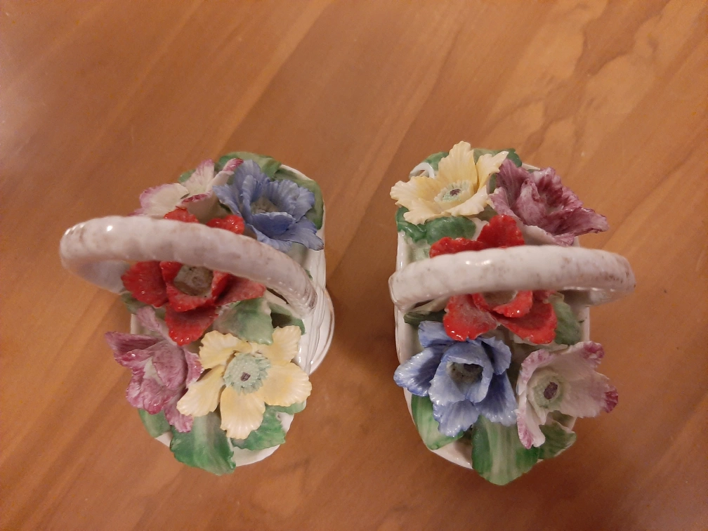 Here's a pair of charming vintage floral basket figurines! They feature a variety of colorful flowers arranged in a white basket. These would be a lovely addition to any collection or a sweet decorative touch to your home.