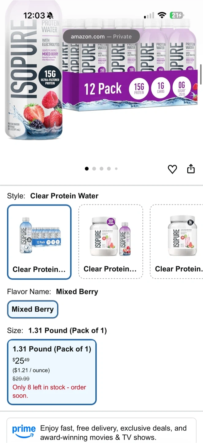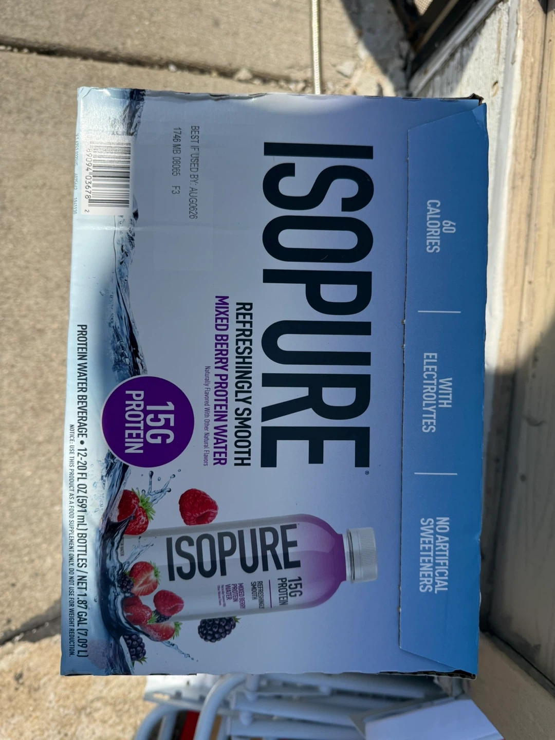This Isopure protein water beverage comes in a refreshing mixed berry flavor. It's a smooth drink with 15g of protein per bottle. It contains 60 calories, electrolytes, and no artificial sweeteners.