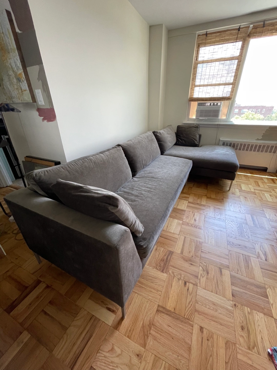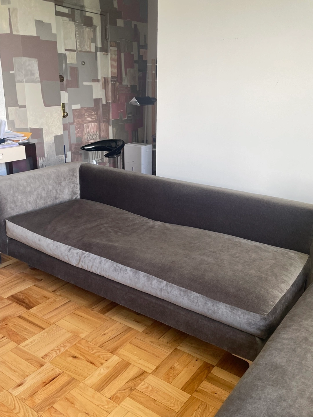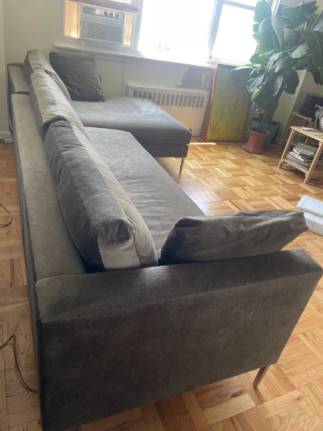 Selling a comfy gray sectional sofa. It's in great shape and ready for a new home! The material is a cotton blend fabric, perfect for lounging. It's a stylish and functional piece that would look great in any living room, many more years left the cushions are in great condition. Firm . Non smoking or pets. Clean reduced from $3800. Price firm . Elevator building