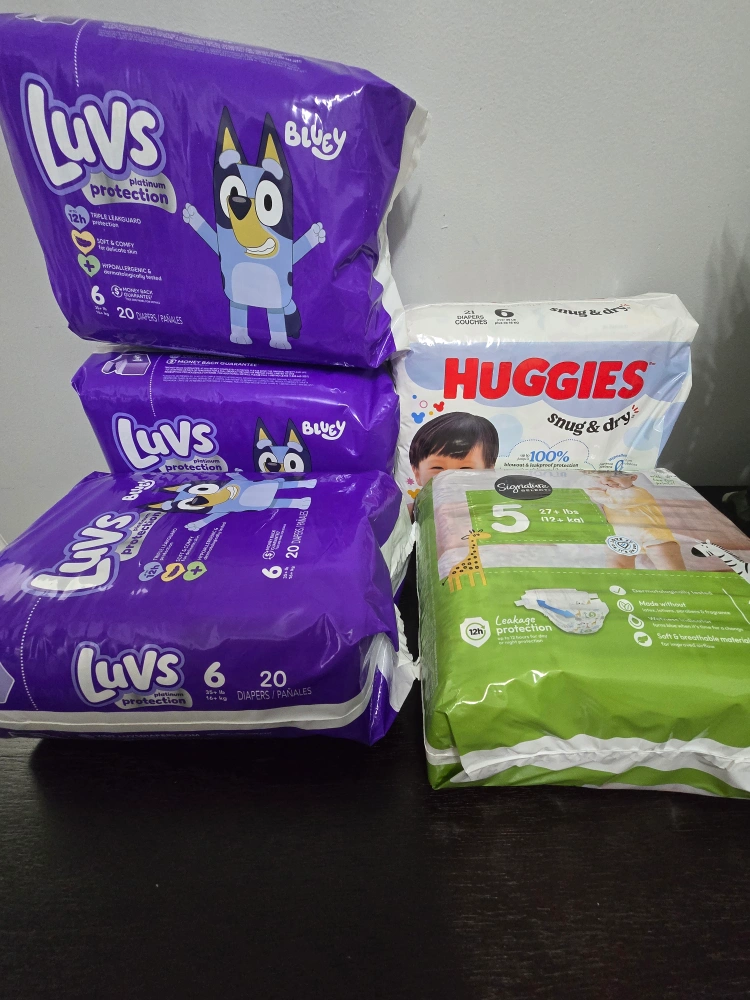 Selling a mix of Luvs Platinum Protection (Bluey) size 6 and Huggies Snug & Dry size 5 diapers! Each pack contains a number of diapers.