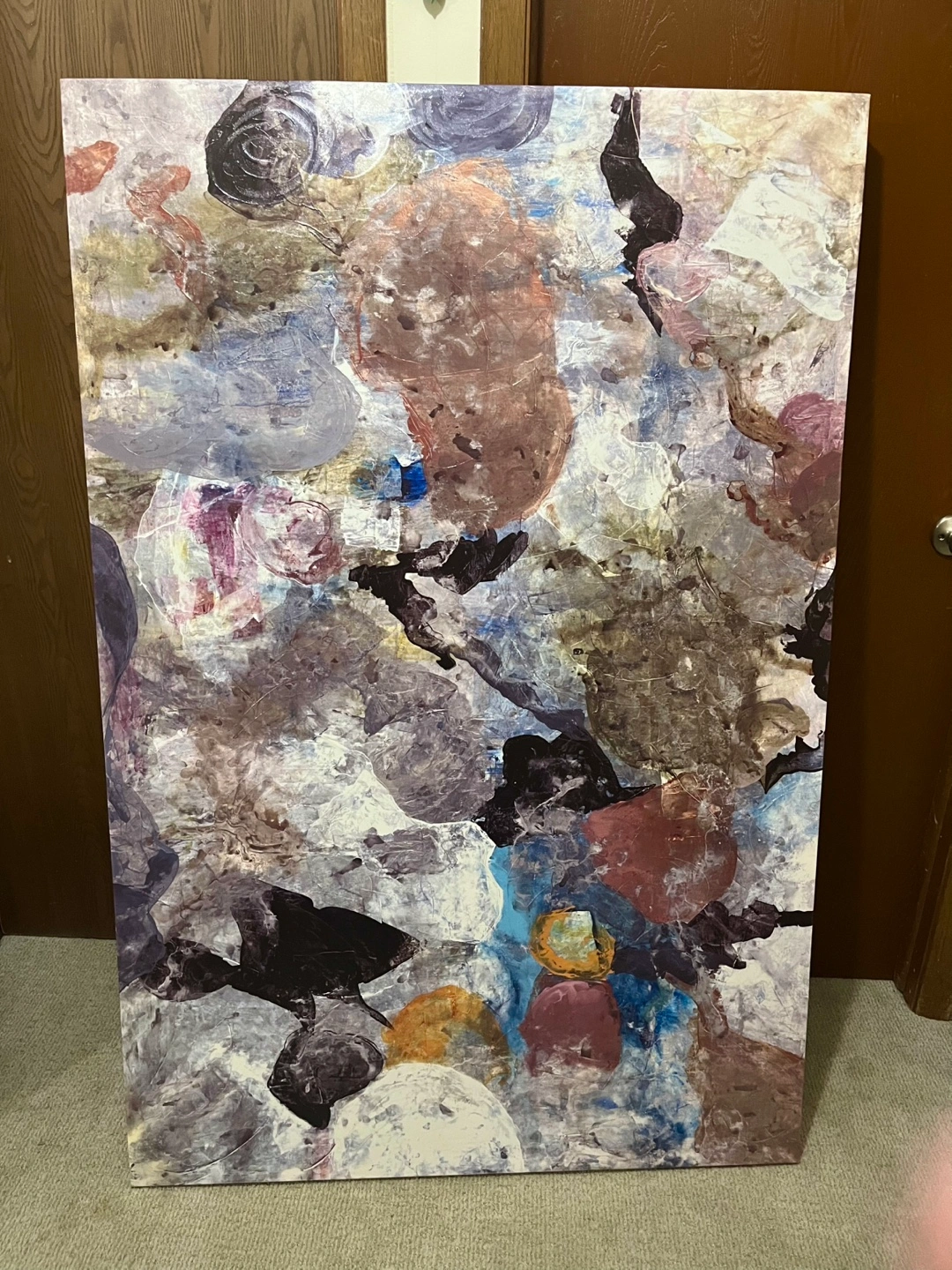 A large acrylic painting on canvas. Features many colors like blue, brown, black and white, with abstract shapes throughout. Could be used to add beauty to any room.