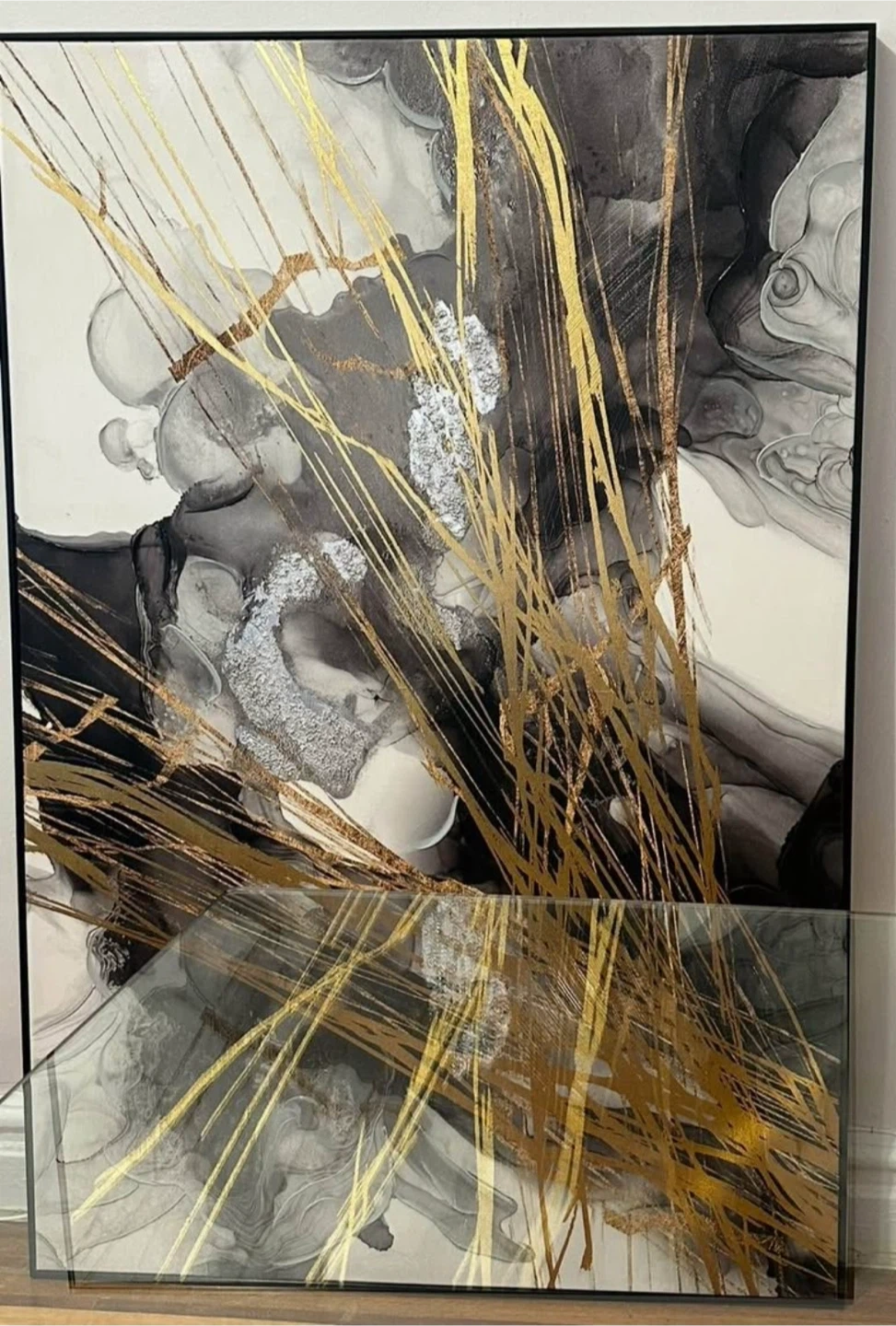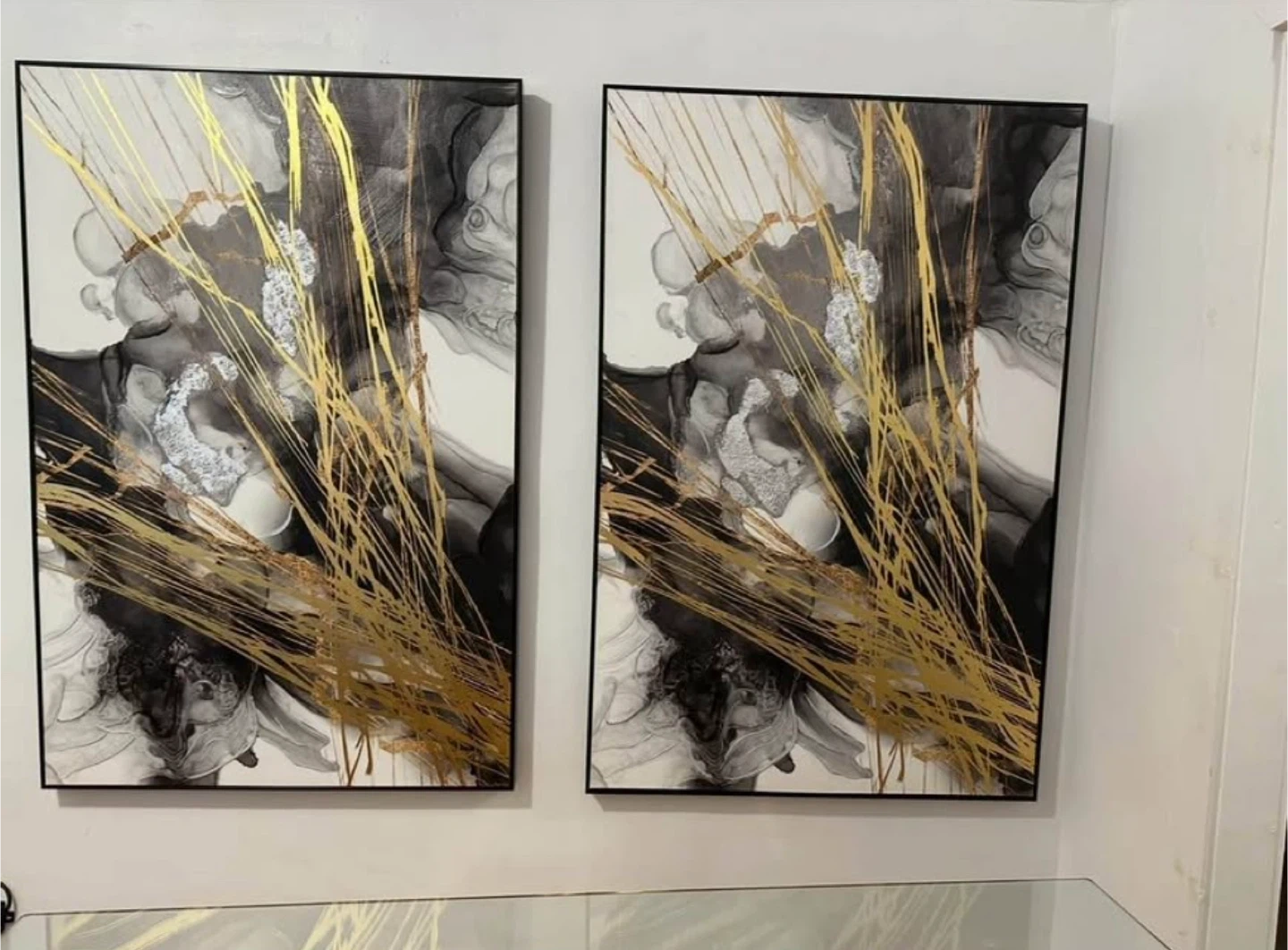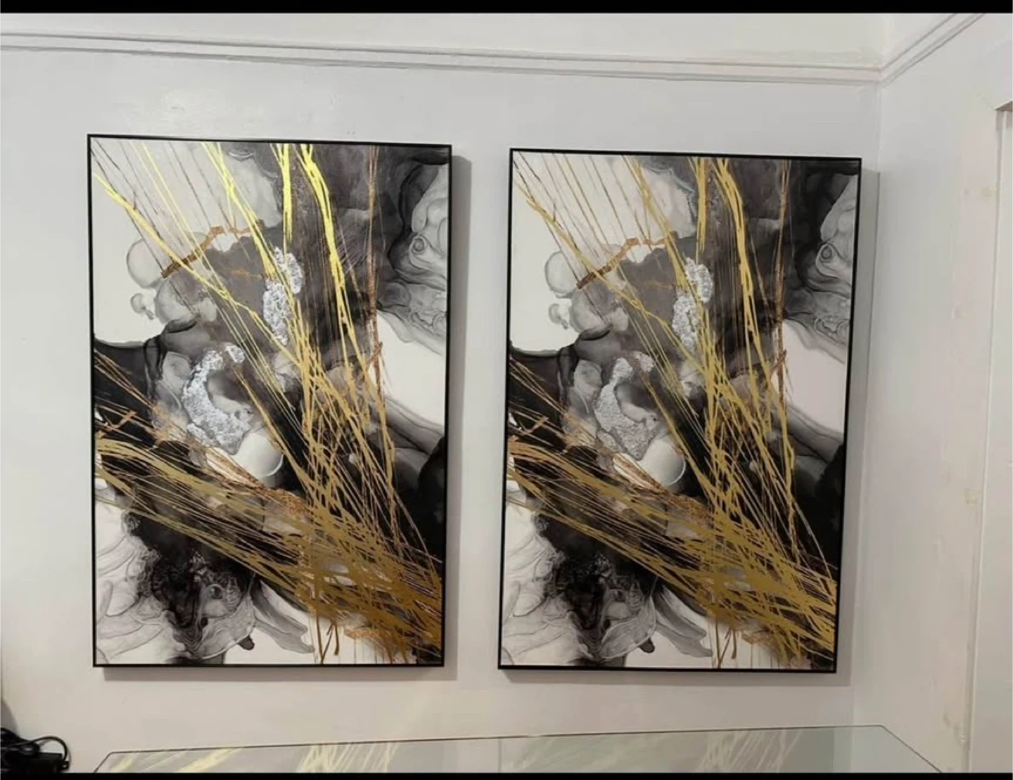 10Selling a set of two abstract wall art pieces. The artwork features a striking combination of black, white, and gold colors, creating a modern and eye-catching design. Perfect for adding a touch of elegance to any room!