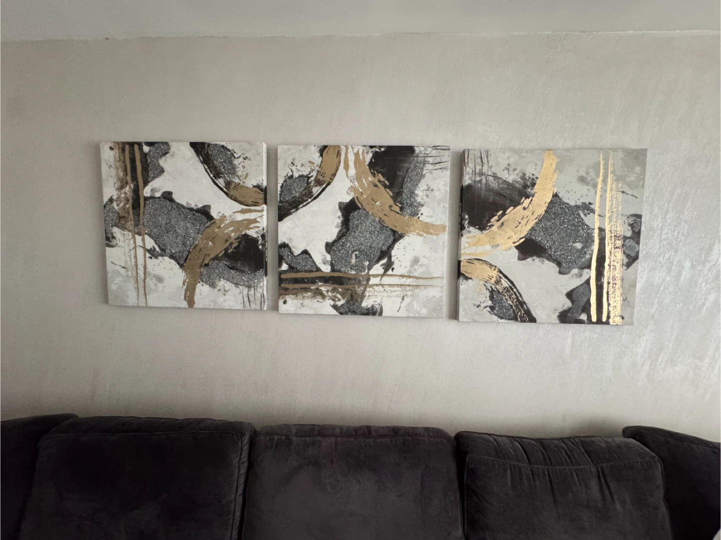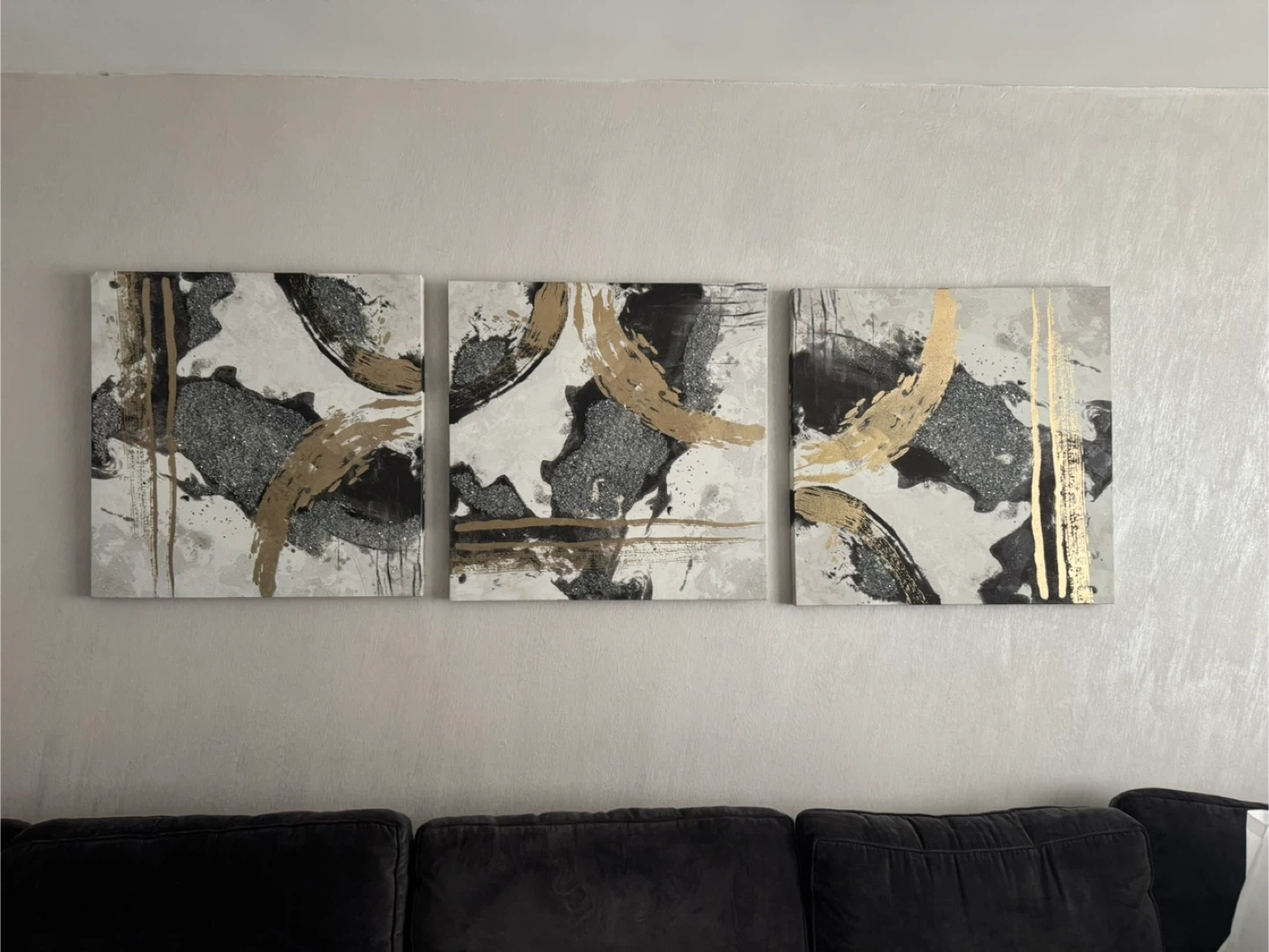 Selling a set of three abstract wall art pieces! They feature a stylish mix of gold and black accents on a neutral background. These canvases are perfect for adding a modern touch to any room. They're in great condition and ready to brighten up your space
