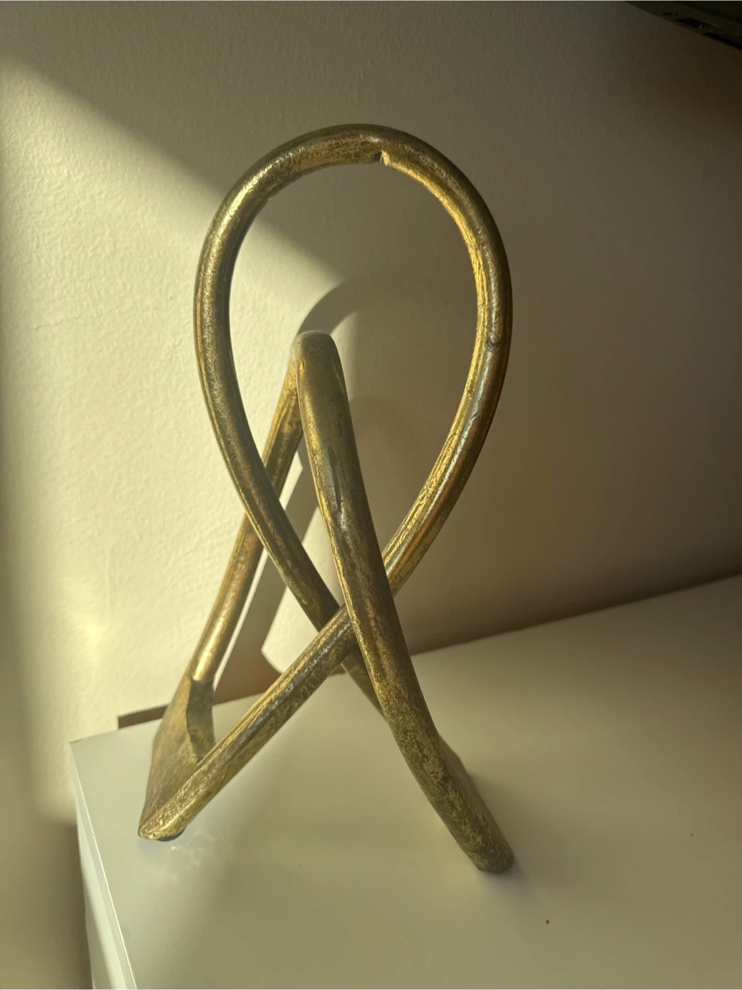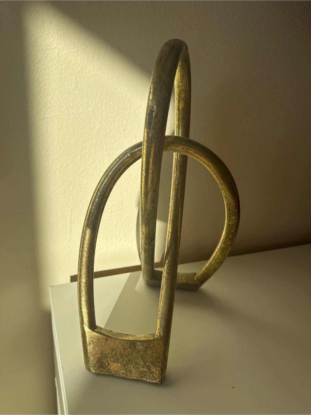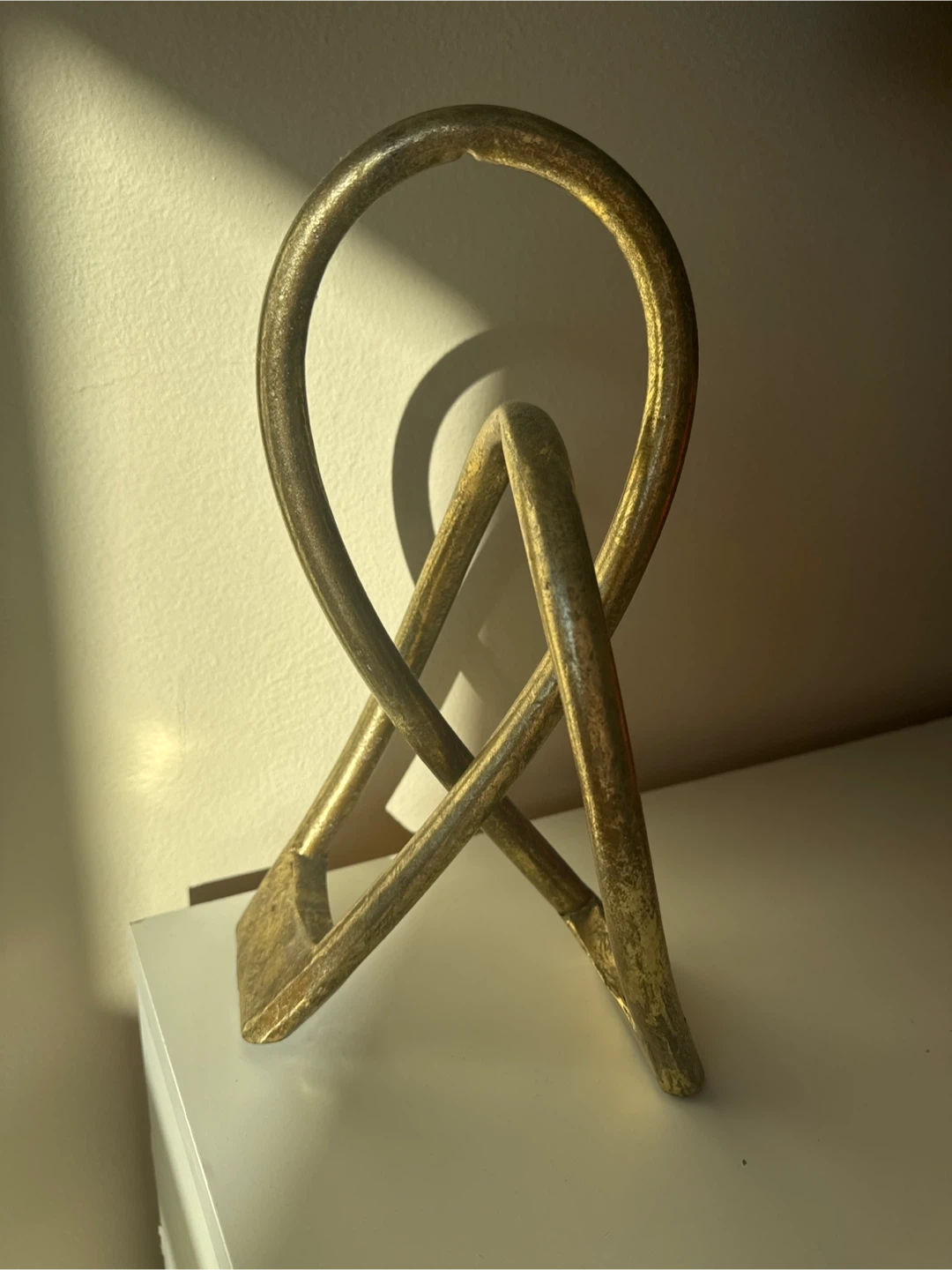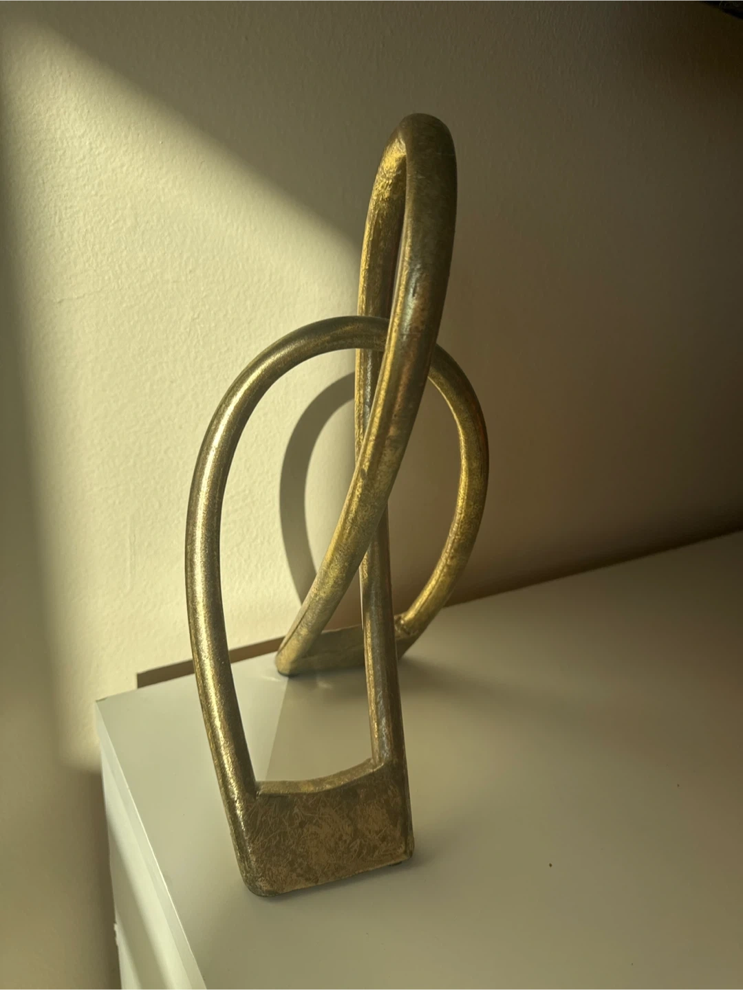 73This is a beautiful abstract sculpture made of gold-colored metal. It would make a great addition to any home or office!