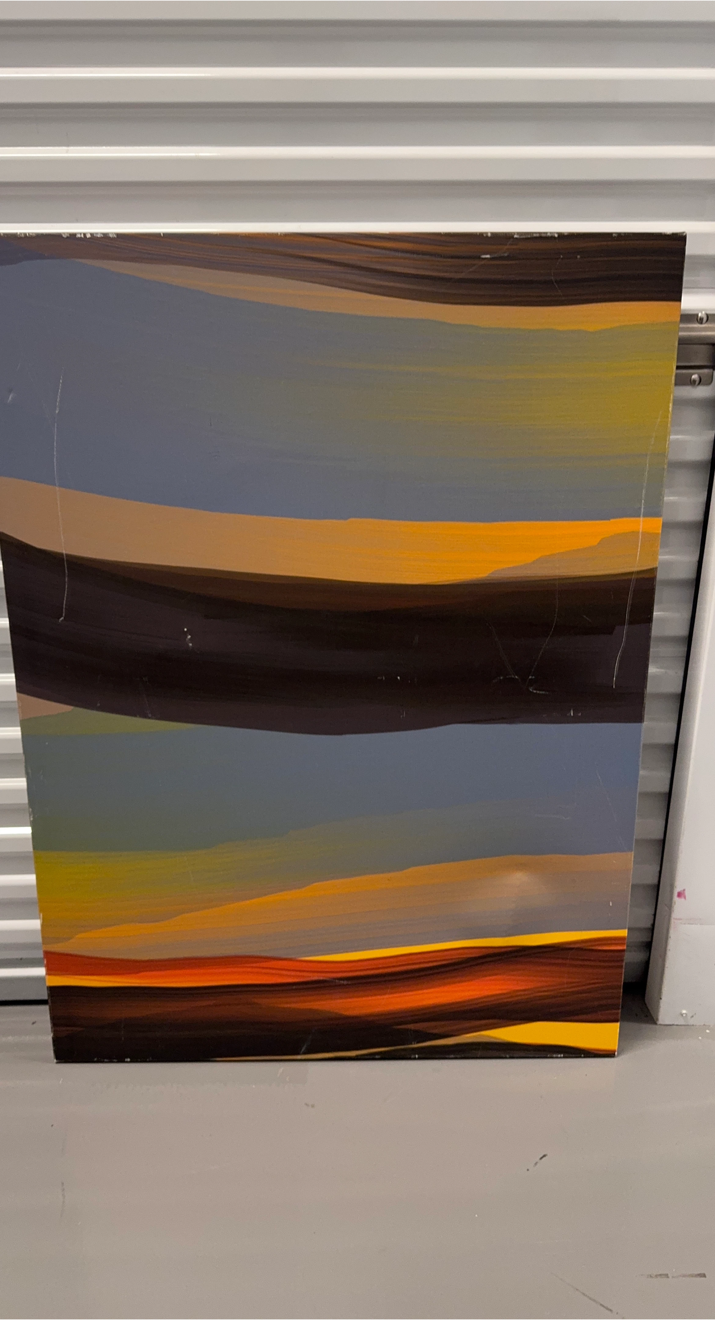 This is an abstract painting with horizontal lines in shades of gray, brown, orange, and yellow. It has some minor scratches on the surface. It would look great in a living room or office!
