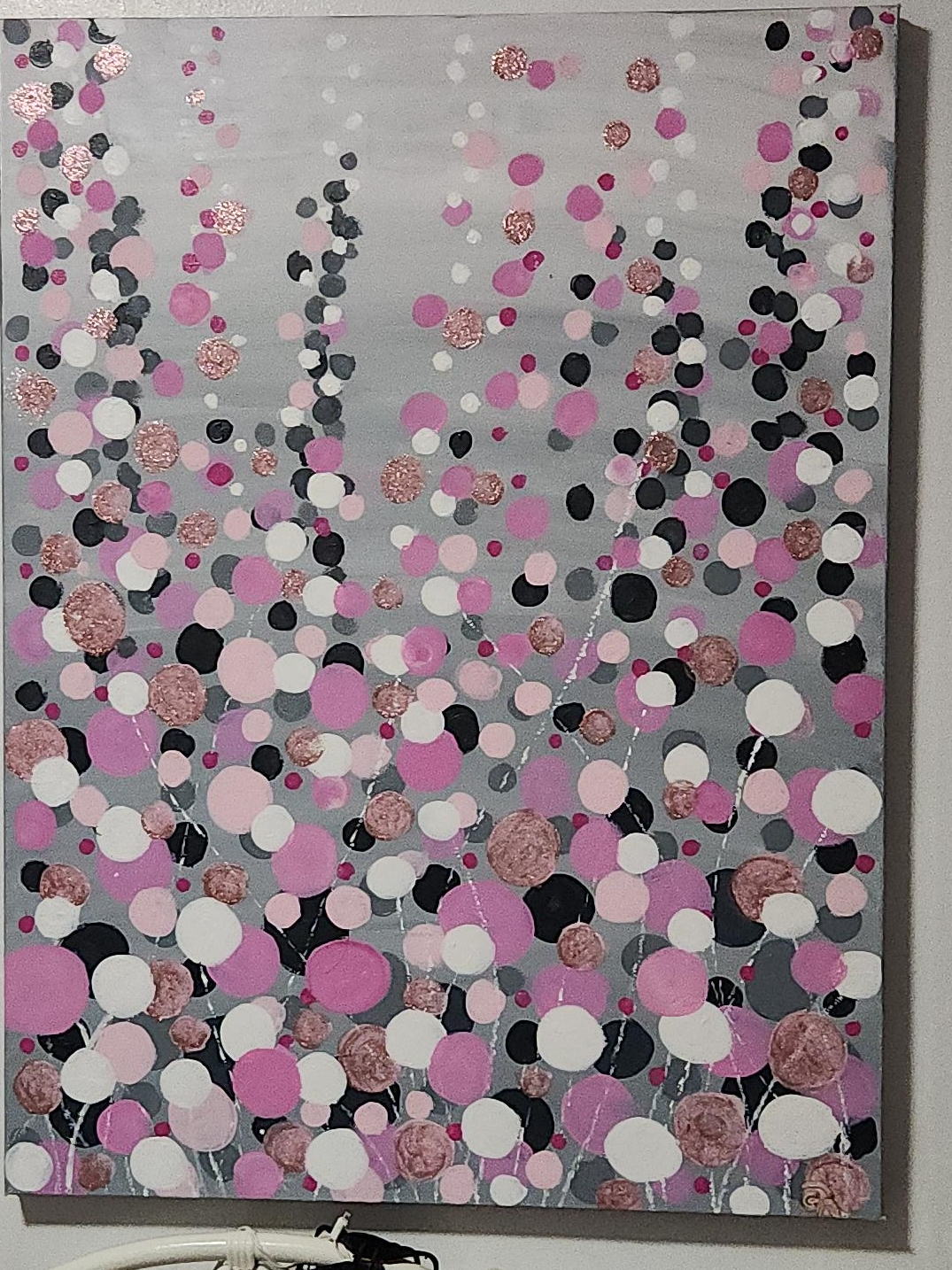 This is an abstract painting featuring pink, black, and white dots on a gray background. It would look great in any room!