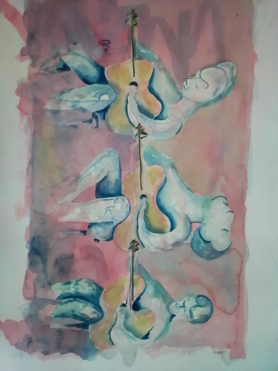 78Very vintage, abstract watercolor painting of 3 seated men playing violen. The artist name is Kos.This vintage painting looks like from the genre of the late 1970's to early 1980's. Painting needs a frame. The dimensions of painting is 19.5 in by 28 in. Will accentuate and look great in a room in your home or in a place of business like an office or artsy coffee shop.