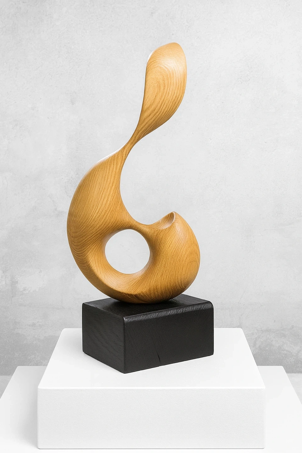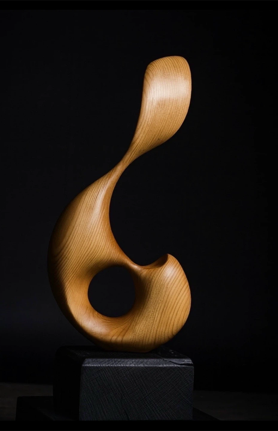 Rebirth in the Grain is an abstract wood sculpture hand-carved from reclaimed hardwood. Its flowing form rises upward with elegance, while the hollow at its heart represents a seed once cast aside—discarded, ruptured, and seemingly empty. Yet, from that inner void comes a new story: the quiet beginning of germination, the push of resilience, the unfolding of new life. Just as a seed cracks to reveal growth, this piece symbolizes the transformation of what was once overlooked into something profound and alive. Mounted on a solid base, the sculpture stands as a reminder of nature’s eternal cycle of renewal—perfect for those who value art with soul, depth, and sustainability. Material: Reclaimed hardwood, hand-carved Finish: Smooth, polished surface highlighting natural grain Dimensions: [8” W x 5”D x 12” H] Theme: Renewal, Growth, Transformation Style: Organic modern décor, symbolic statement art Ideal as a centerpiece for homes, galleries, or offices—wherever inspiration and natural beauty are meant to bloom.