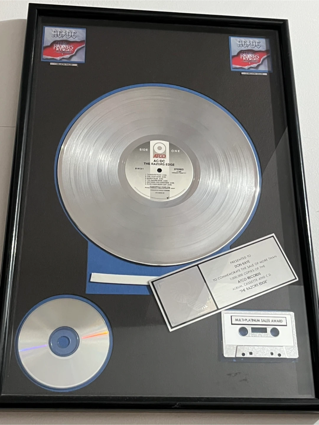 Selling a framed platinum record award commemorating AC/DC's album "The Razors Edge"! It's a cool piece of music memorabilia and would look great on display for any AC/DC fan