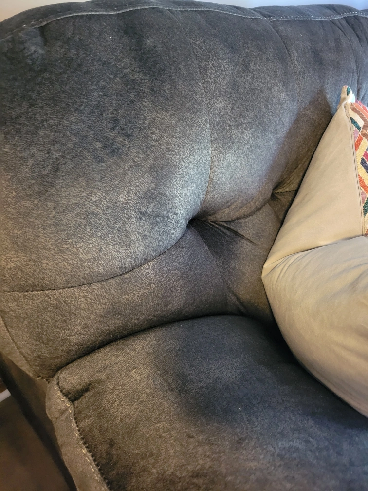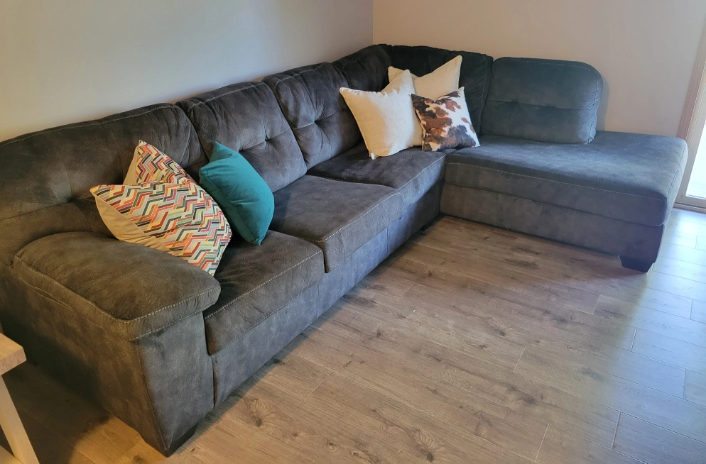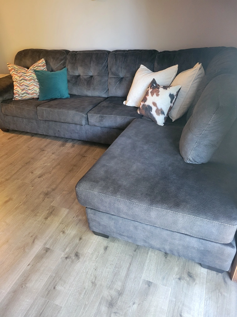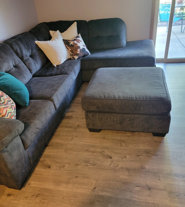 Accrington Sectional Sofa in slate gray, left arm facing. Purchased $1300 new. Gently and rarely used, no rips tears or stains. Smoke free home. Ottoman is from a different company with slightly different texture than sofa so not an exact match but can be sold with or without ottoman. Pillows not included. Local pickup up only, you haul away. Located on first floor condo no stairs.