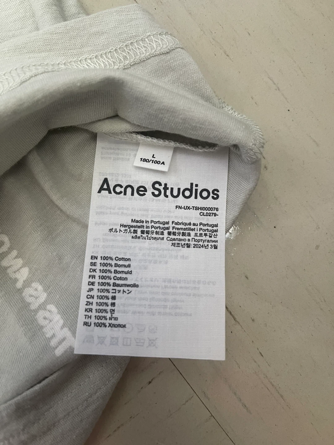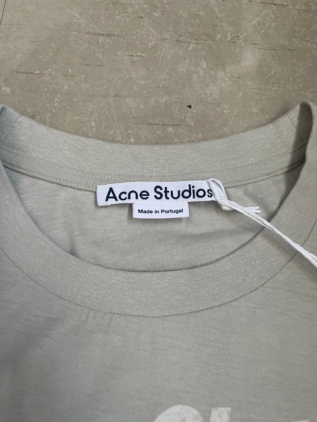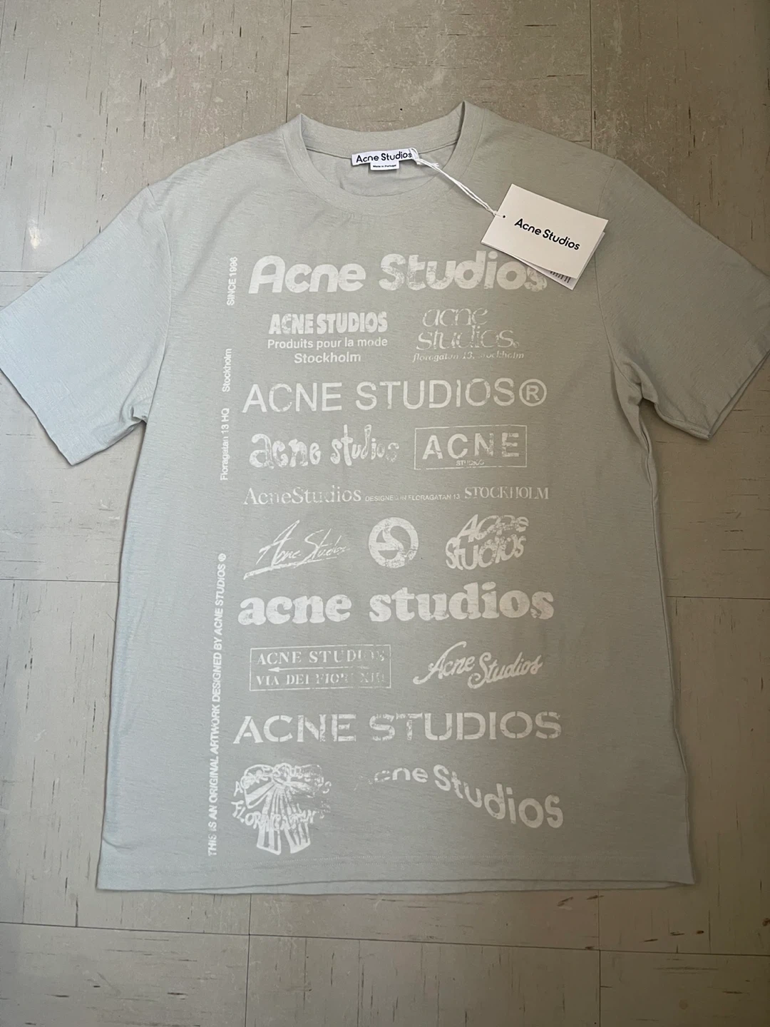 Selling a cool Acne Studios tee with a graphic print! The size is L, from cotton with a slub texture. It features stretch-jersey, a ribbed crew neck, short sleeves, a straight hem, and a logo print on the front and rear. This is a unisex item graded in standard sizing.