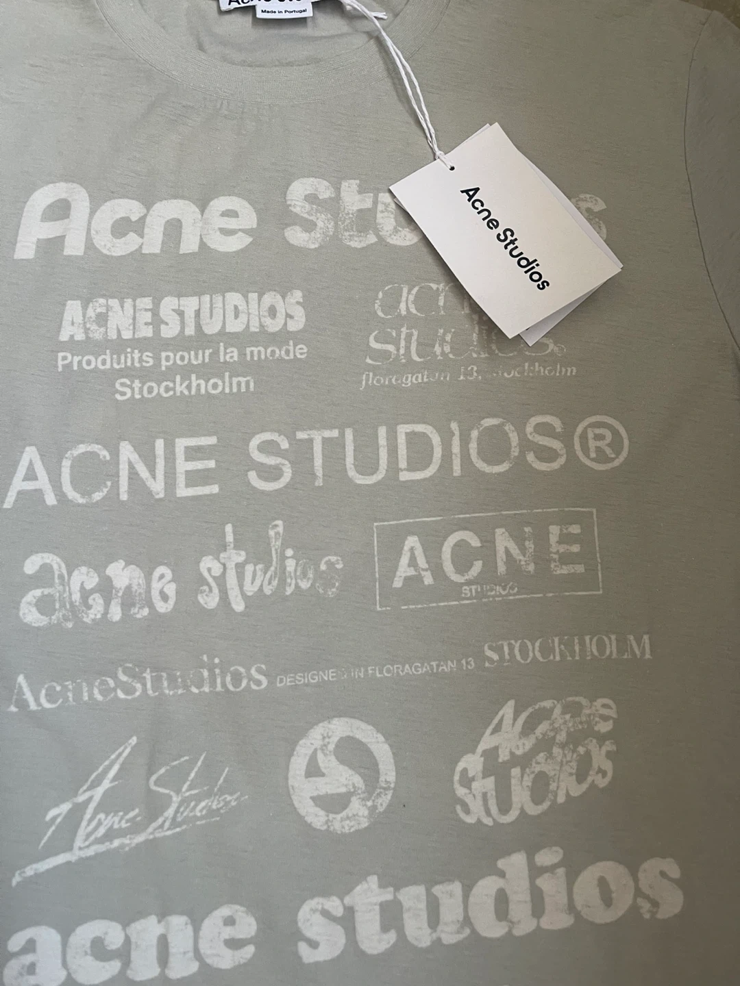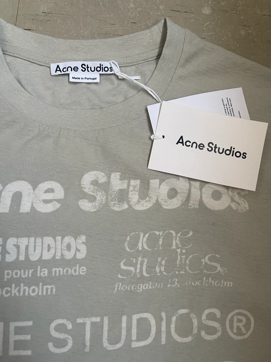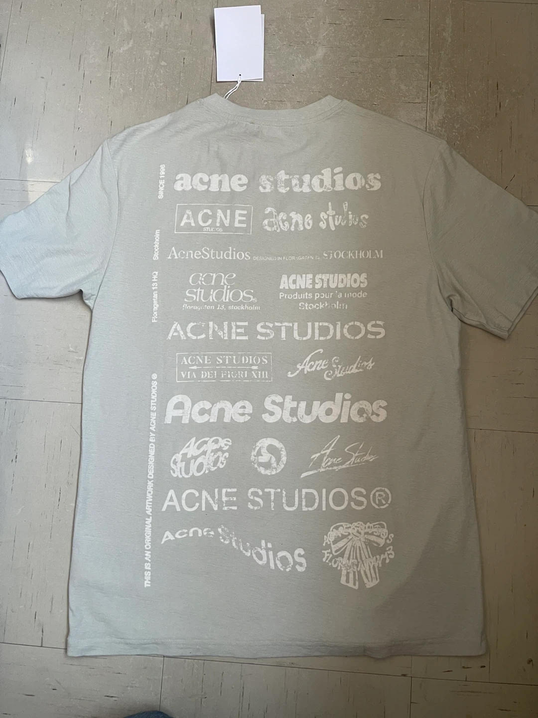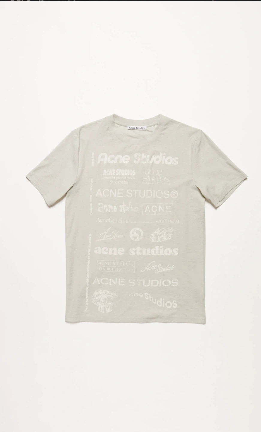 Selling a cool Acne Studios tee with a graphic print! The size is L, from cotton with a slub texture. It features stretch-jersey, a ribbed crew neck, short sleeves, a straight hem, and a logo print on the front and rear. This is a unisex item graded in standard sizing.