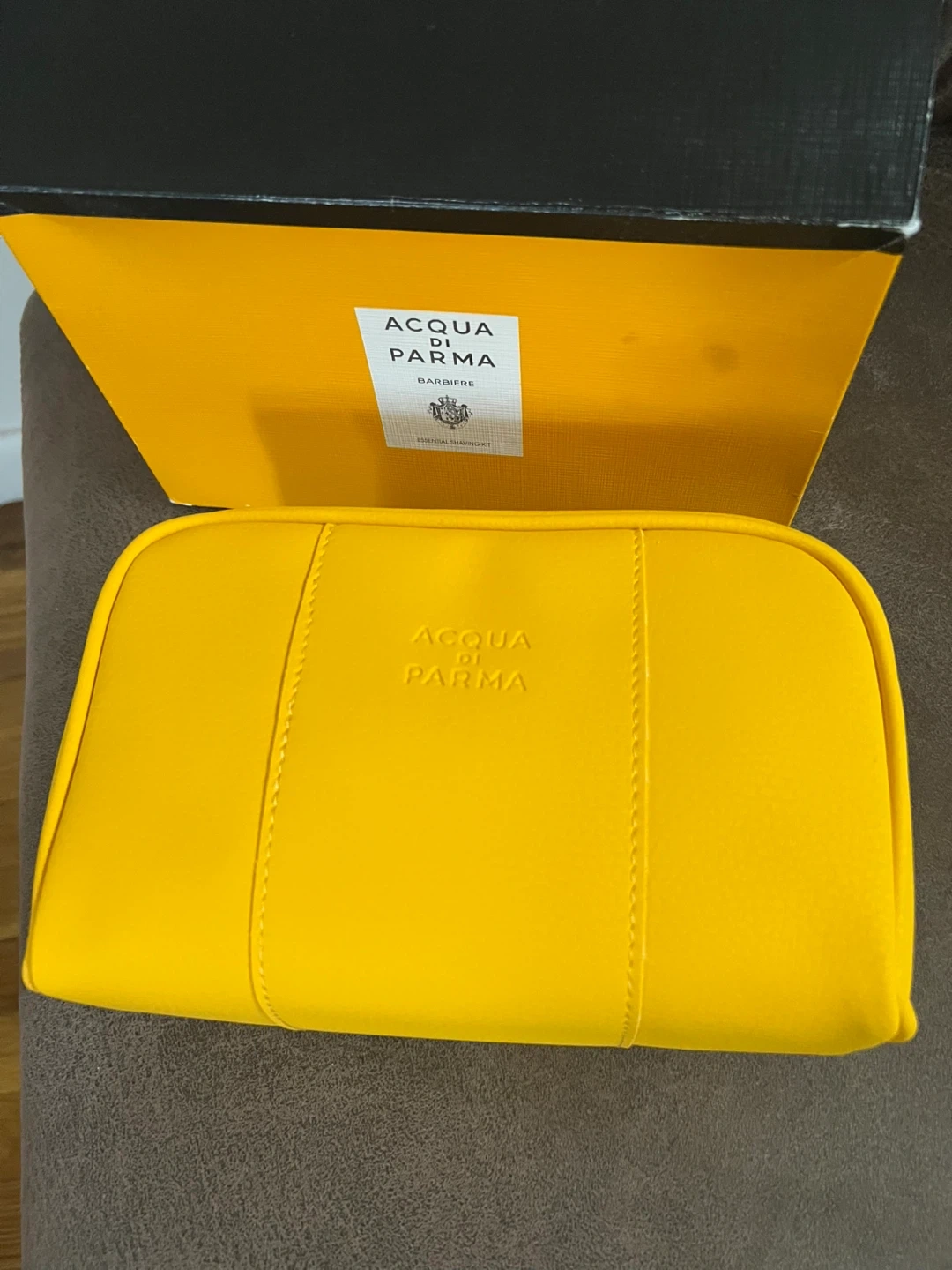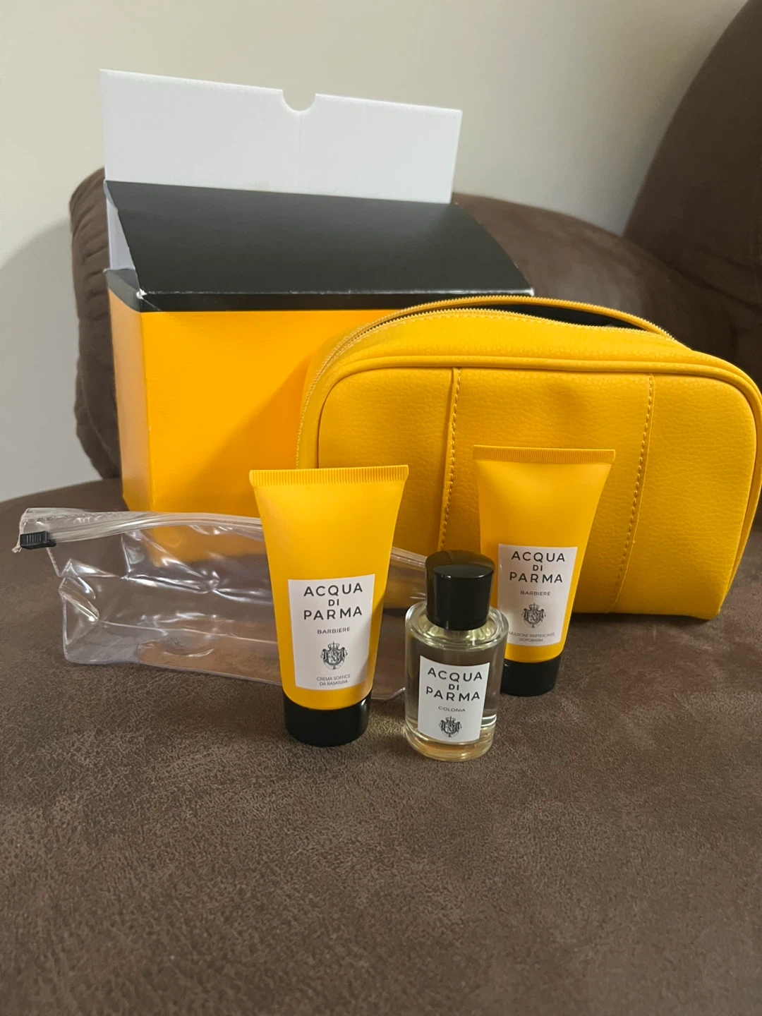 Selling an Acqua Di Parma Barbiere travel set! The set includes a yellow travel bag, a bottle of cologne, and two tubes of shaving cream. The box is included as well
