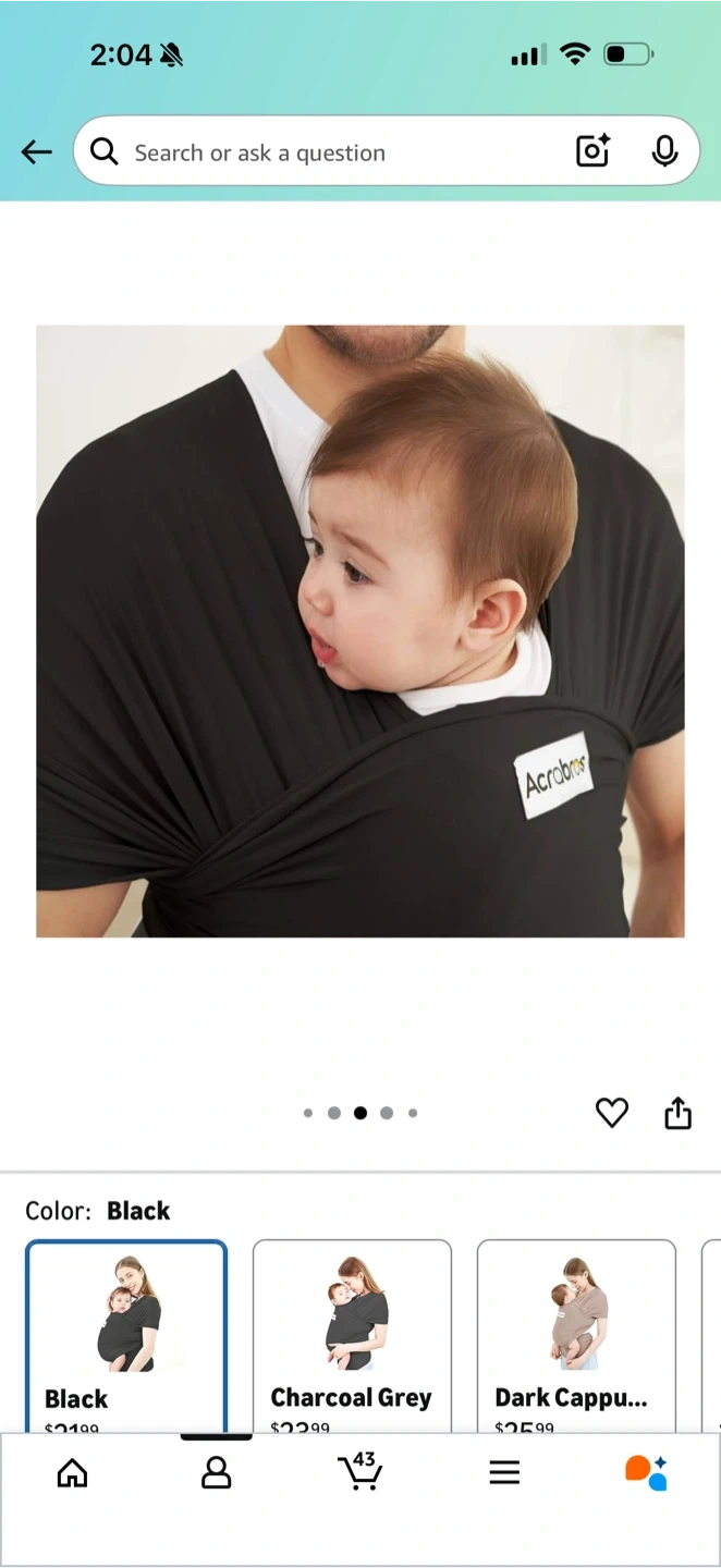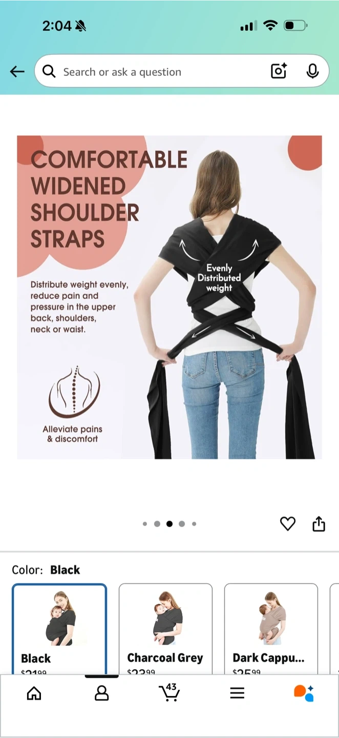 This is an Acrabros baby wrap carrier in black. It features comfortable widened shoulder straps to evenly distribute weight, reducing pain and pressure in the upper back, shoulders, neck, or waist. It's designed to alleviate pains and discomfort. Perfect for keeping your little one close and secure!