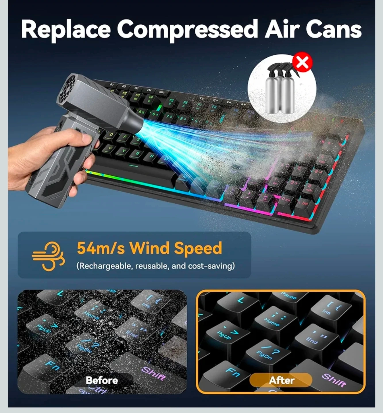 Compressed Air Duster, 130000RPM Electric Air Duster Brushless Motor with Stepless Speed Adjustable, Rechargeable Fast Charging Cordless Mini Air Blower for PC, Keyboard, Car, Home & Outdoor
