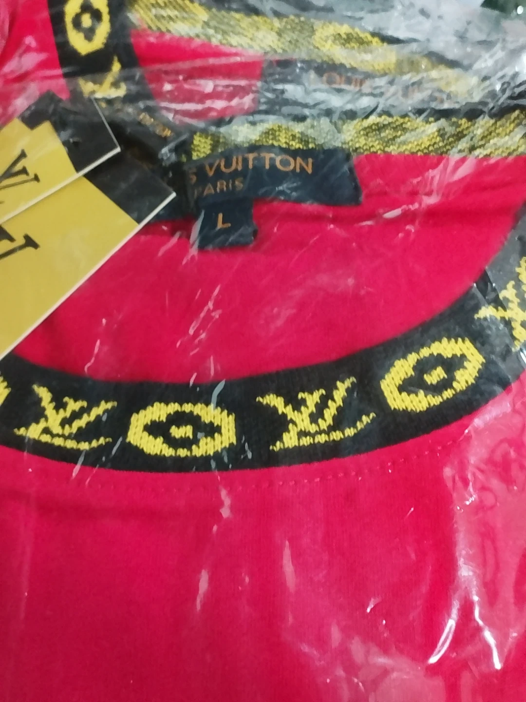 Red Louis Vuitton t-shirt. Features large yellow LV logo and "LOUIS VUITTON" text. Size L. Collar has "LV" pattern detail. New with tags.