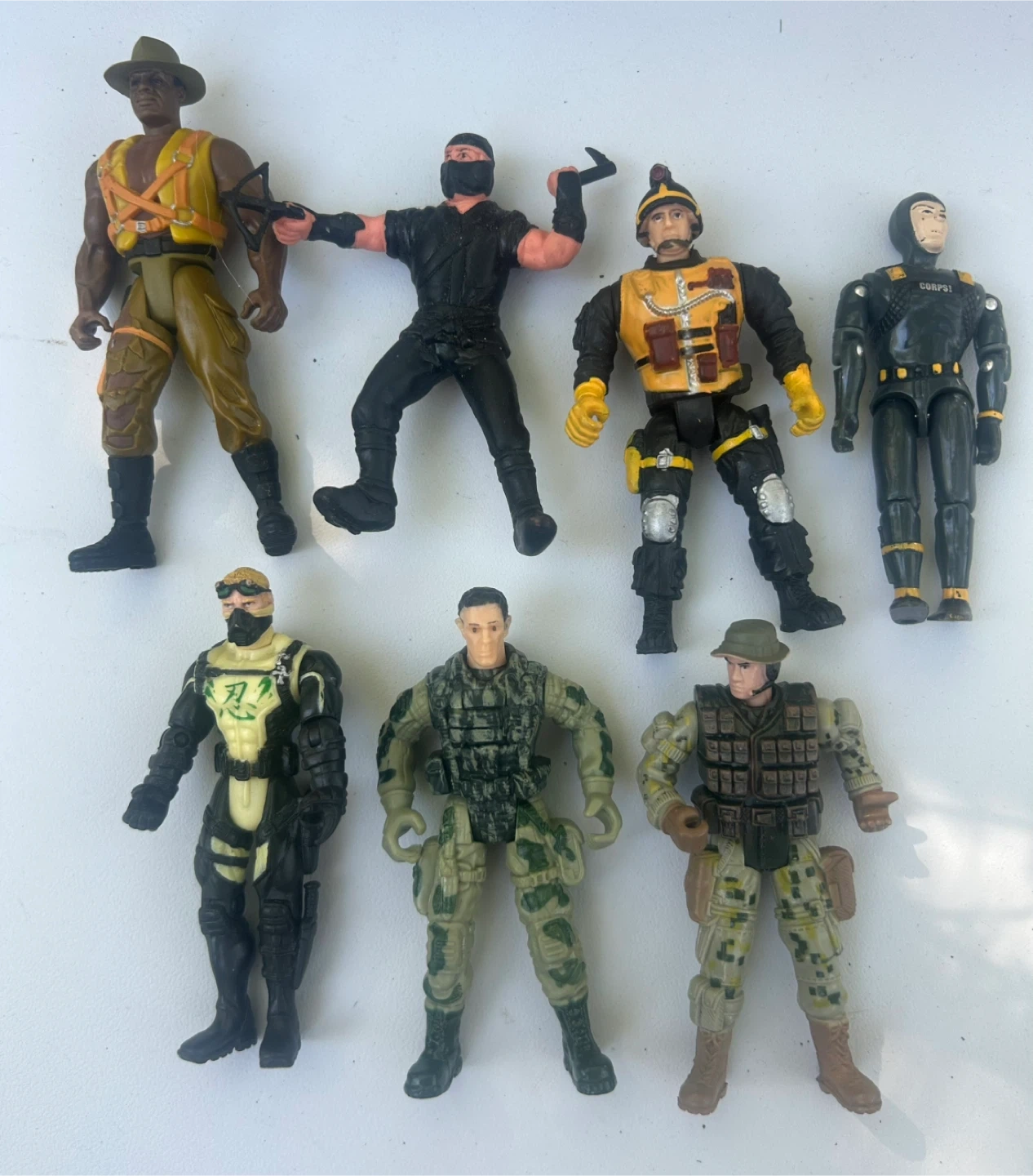 Selling a set of action figures with a military theme. There are seven figures in total, each with different outfits and accessories. They're in ok condition and ready for a new home!