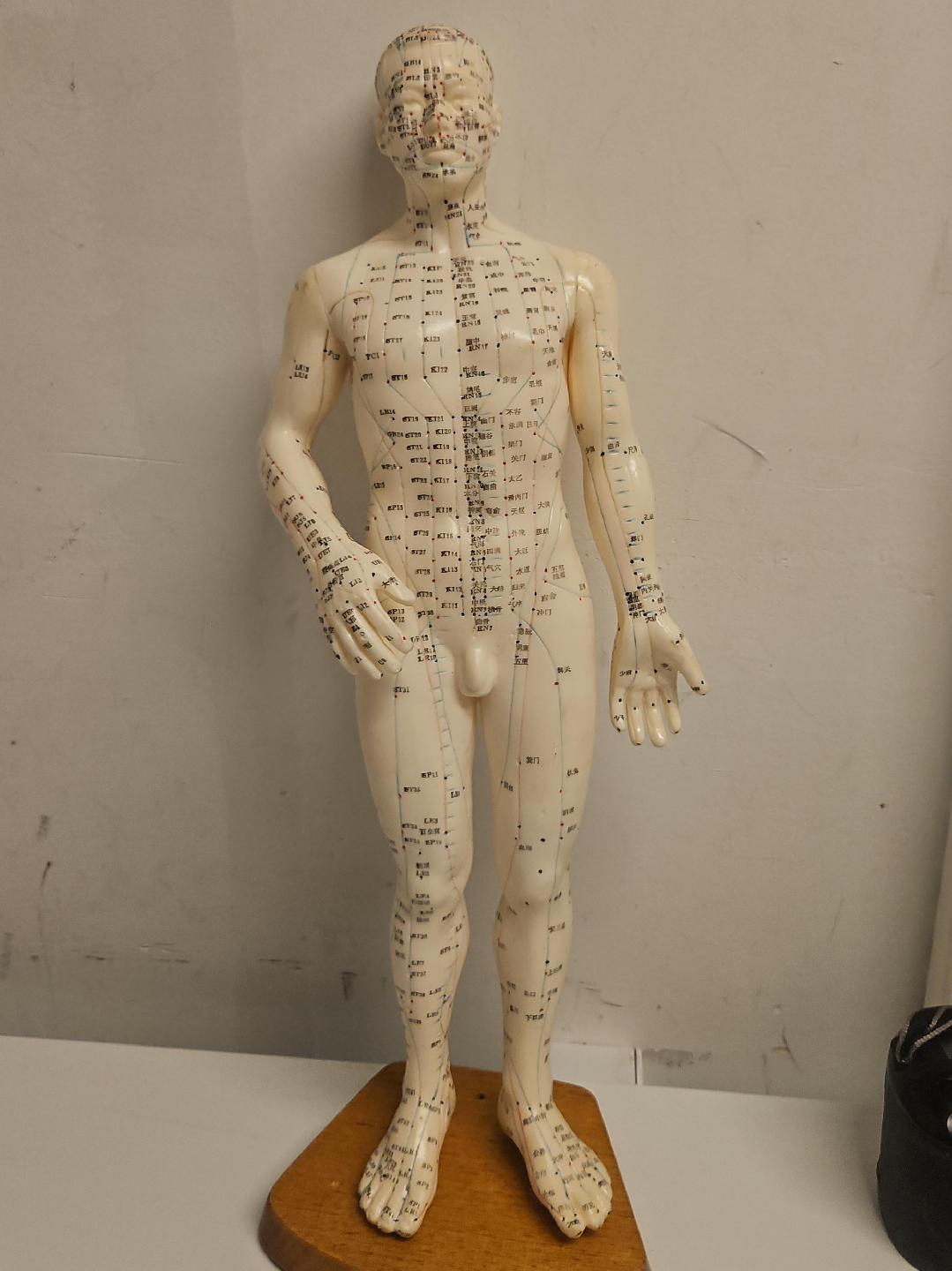 60This is an acupuncture model with markings and labels indicating acupuncture points. It's a great tool for learning or demonstration purposes