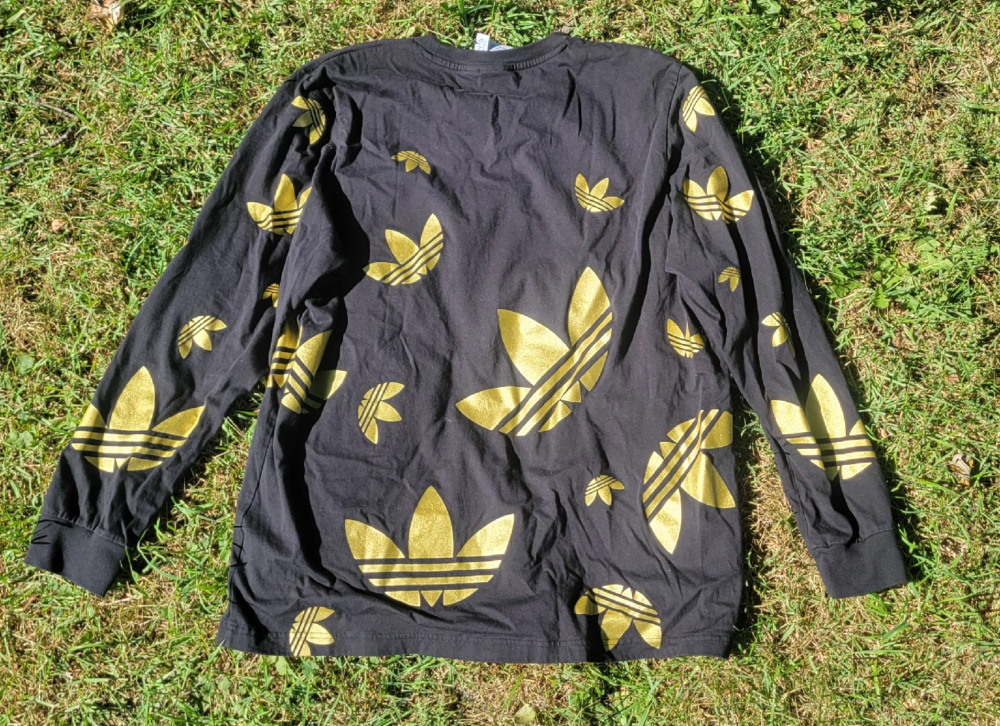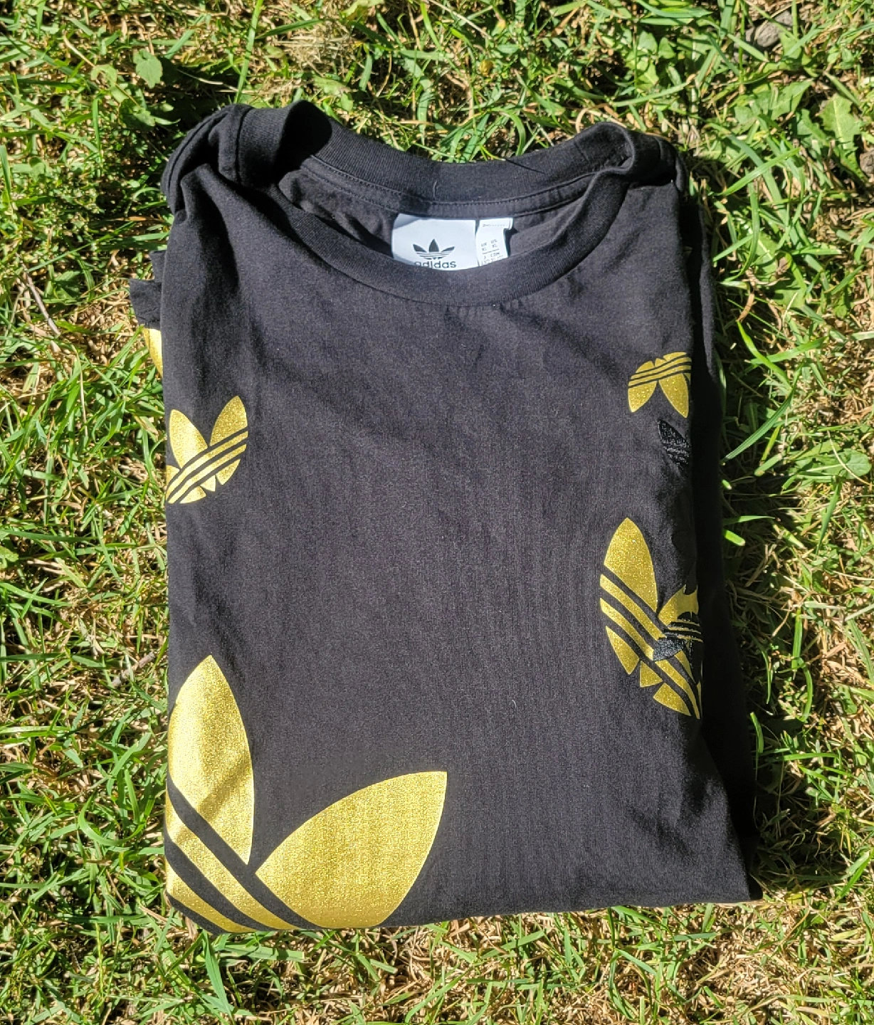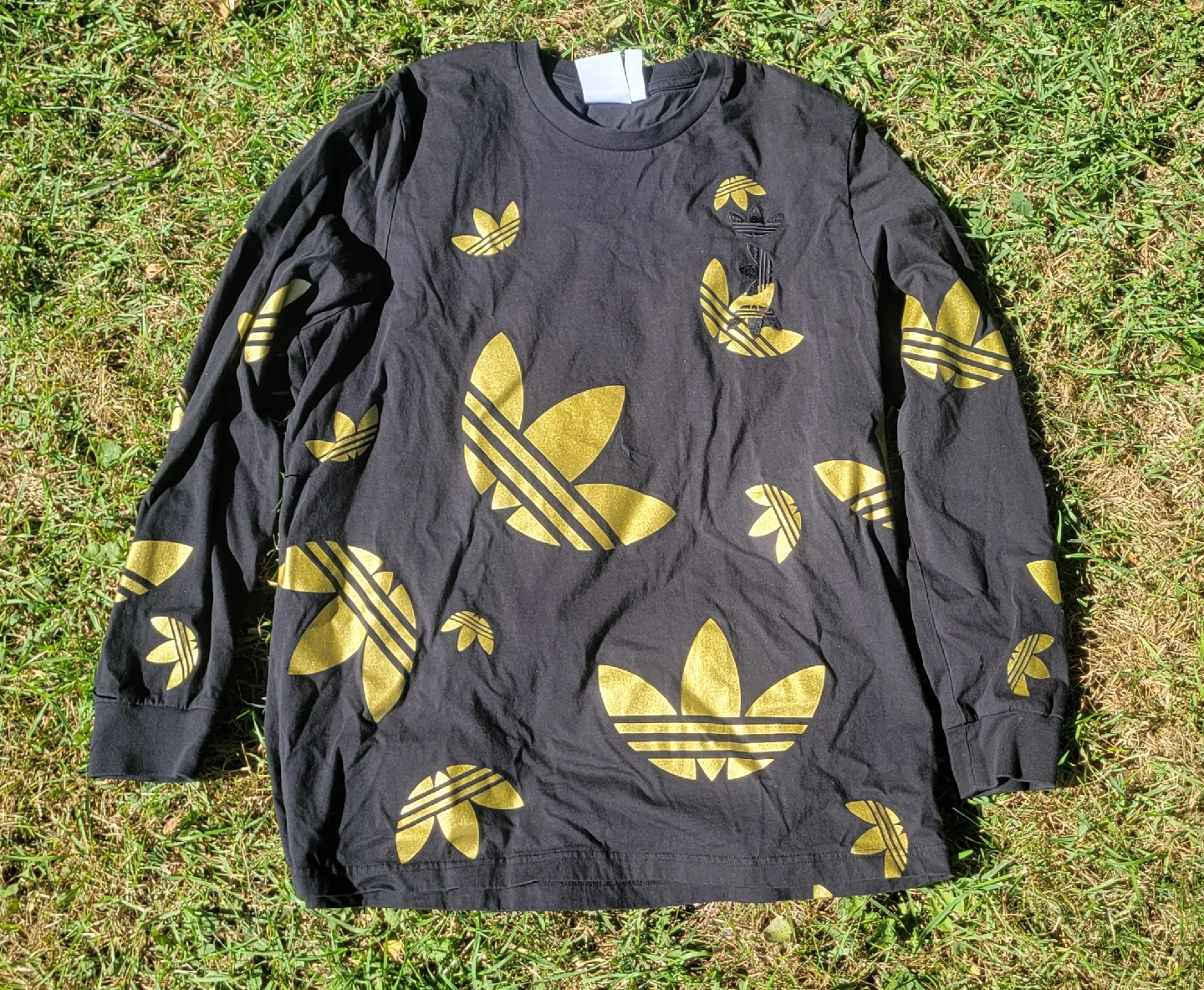 Selling an Adidas long sleeve shirt in size Men's XL. It's black with gold trefoil logos all over. The material is soft and comfortable, perfect for casual wear!