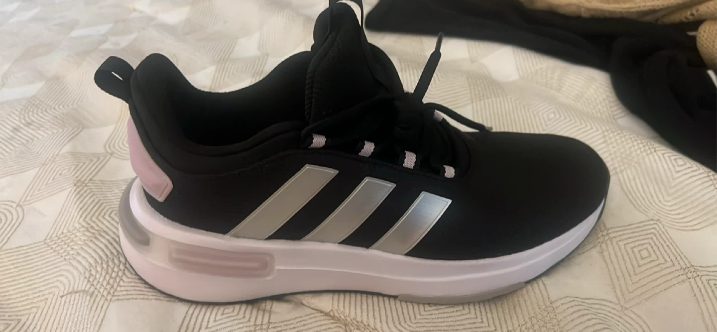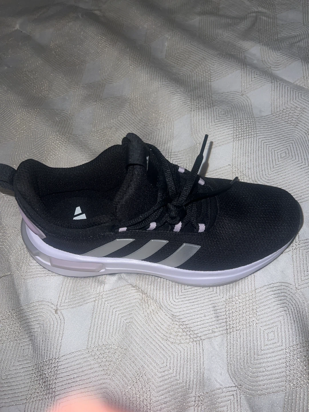 Selling a pair of Adidas running shoes in black. They are in good condition and ready for a new home! The shoes feature the classic Adidas three-stripe design in silver. Perfect for running or everyday wear!