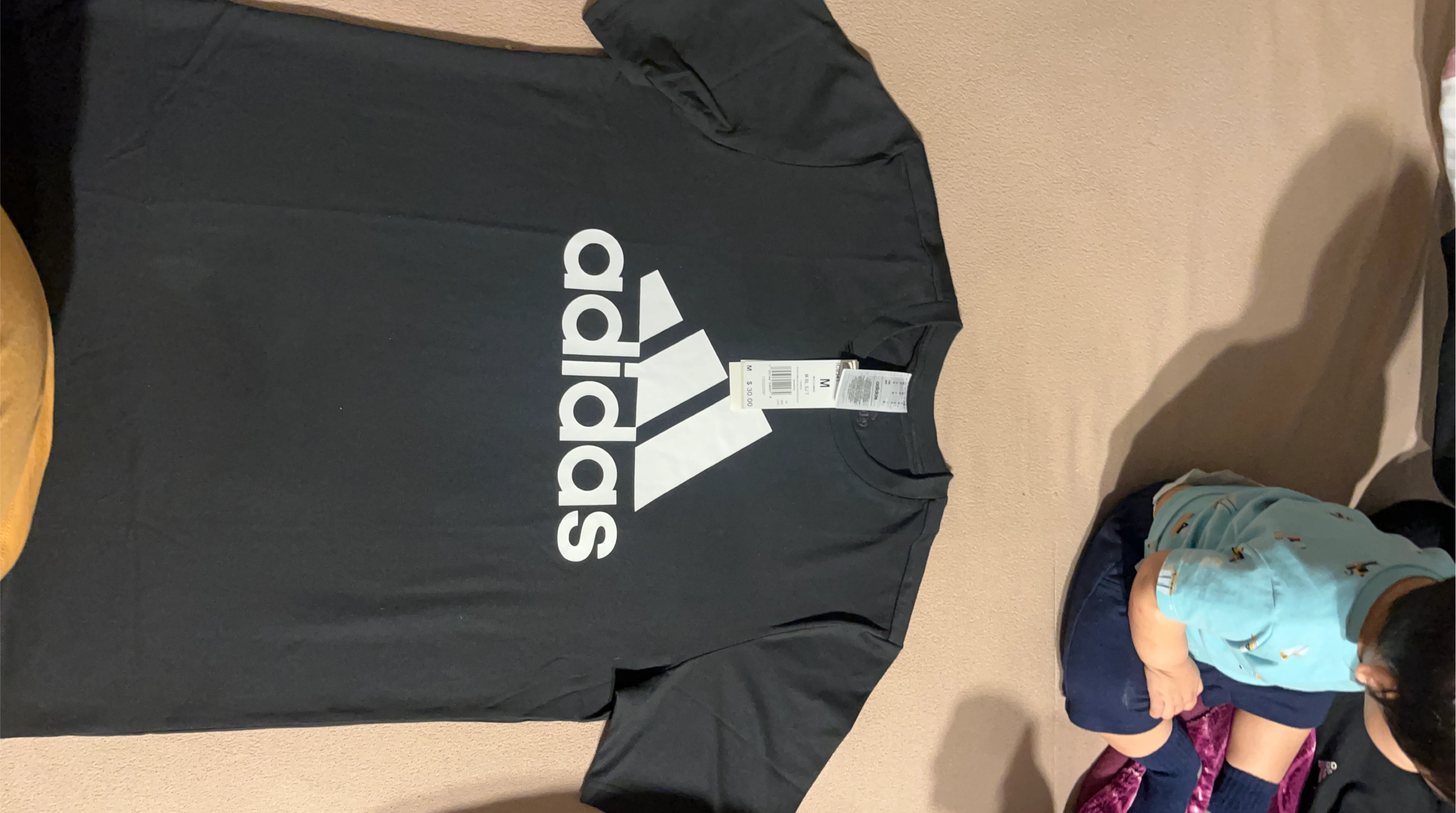 Selling a black Adidas t-shirt in size medium. It has the classic Adidas logo on the front. The tag shows it was originally $30. Perfect for workouts or casual wear!