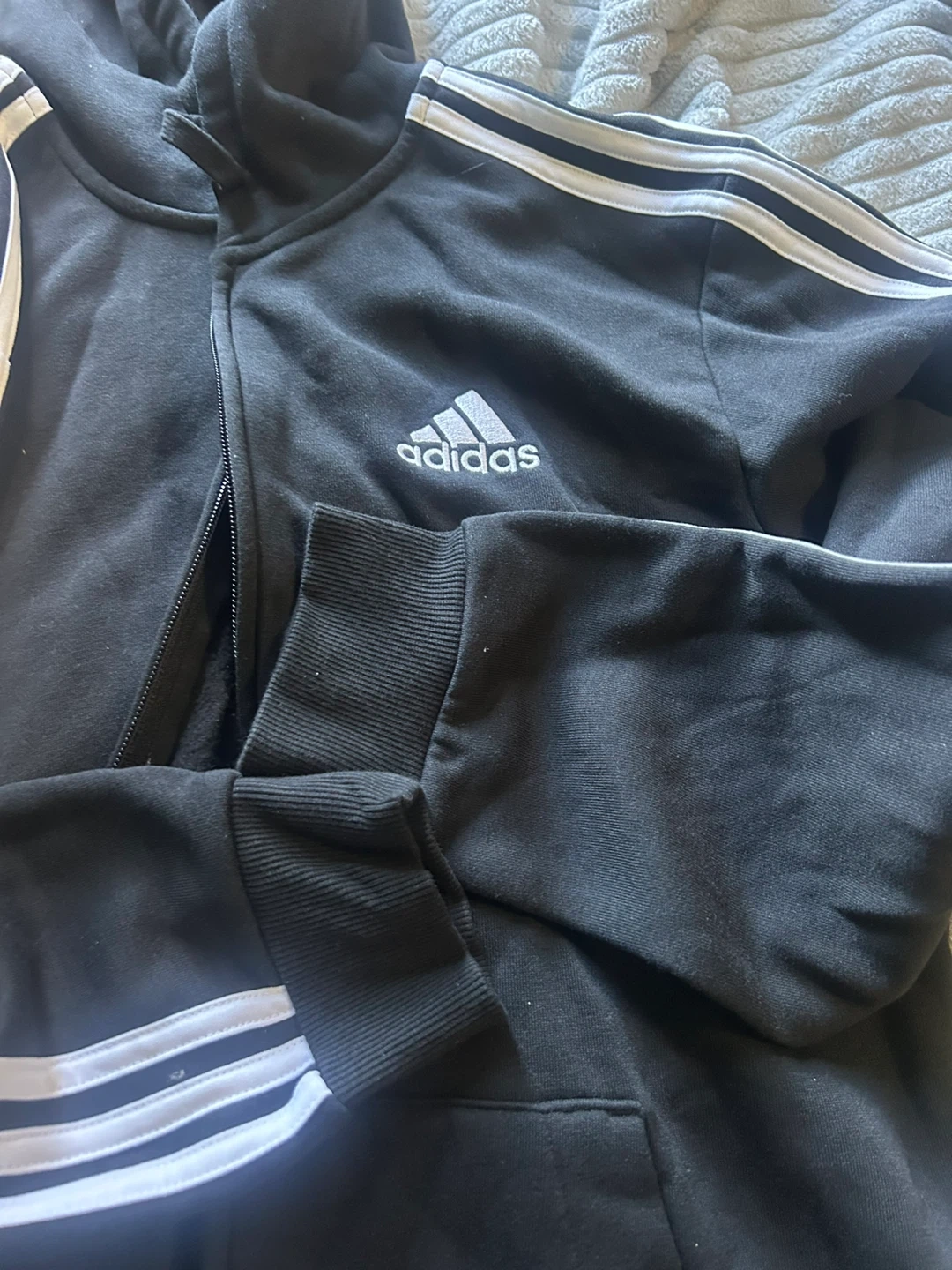 20Selling a black Adidas track jacket. It features the classic three stripes on the sleeves and the Adidas logo on the chest. It's in good condition and perfect for workouts or casual wear