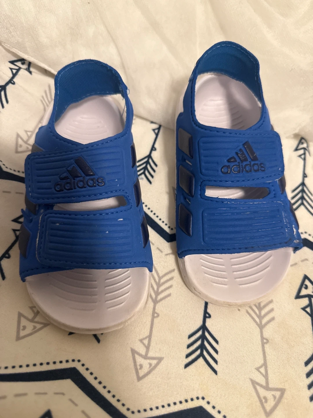 These are a pair of blue Adidas sandals. They feature the Adidas logo and are in good condition. Perfect for your little one!